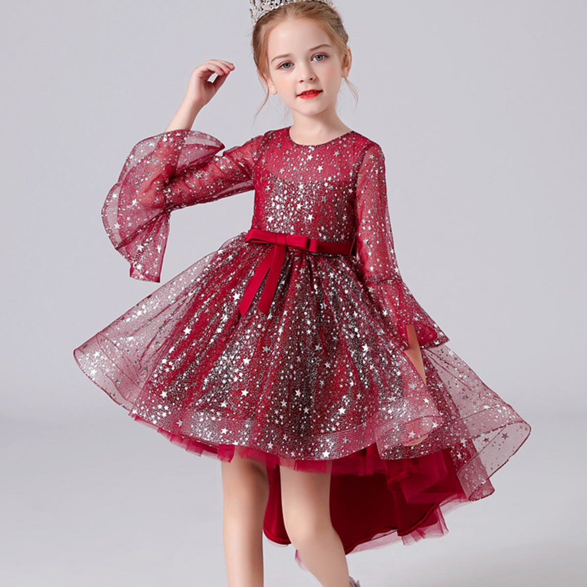 Kids Girls Bowknot Star Mesh Catwalk Trailing Dress Wholesale