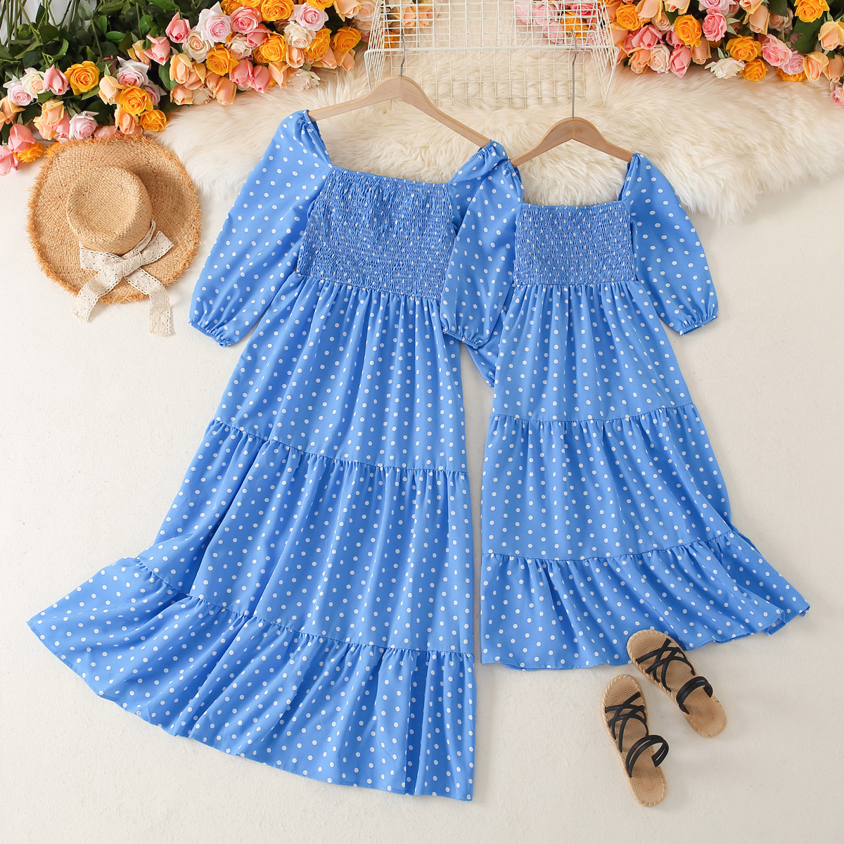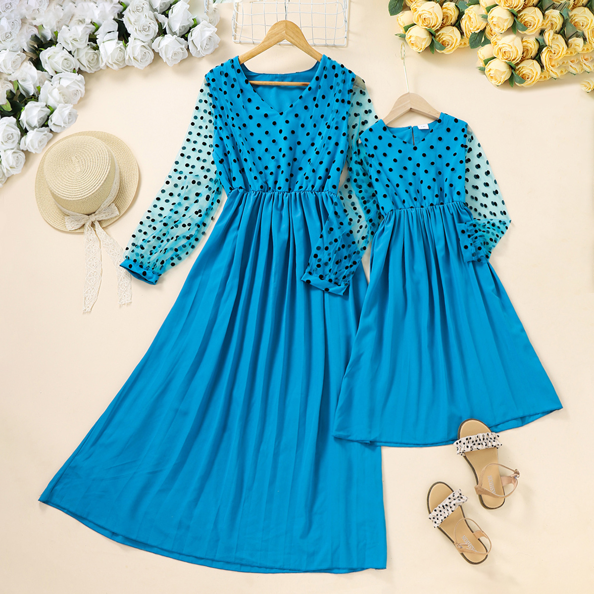 Causal Wave Point Print Long Sleeve Dress for Mom and Me Wholesale