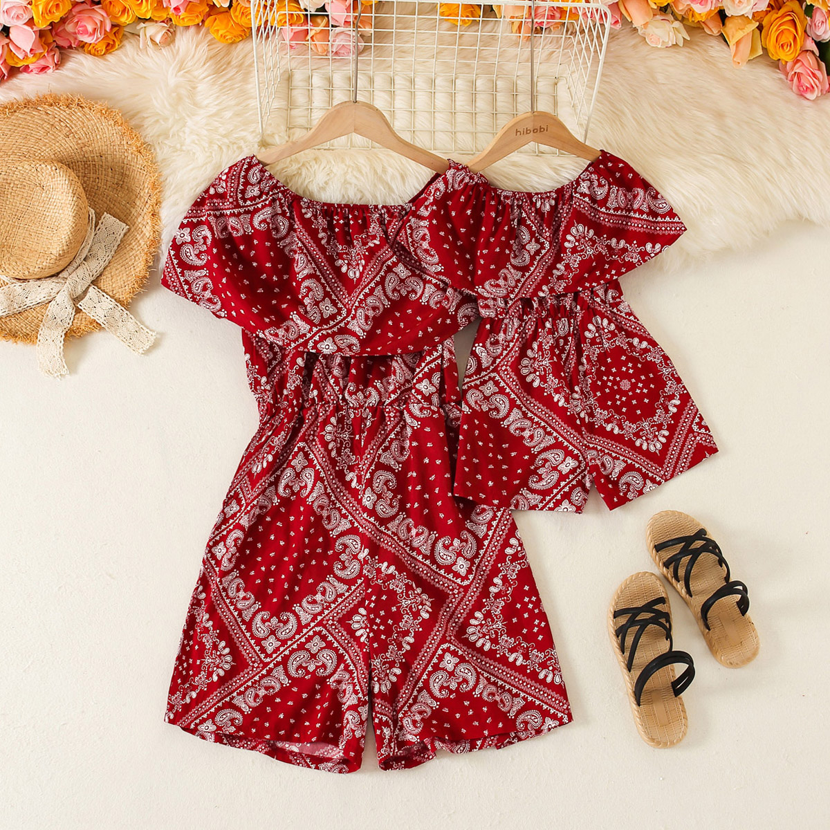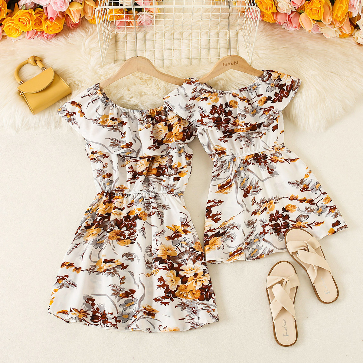 Causal Floral Print Short Sleeve Off Shoulder Dress for Mom and Me Wholesale
