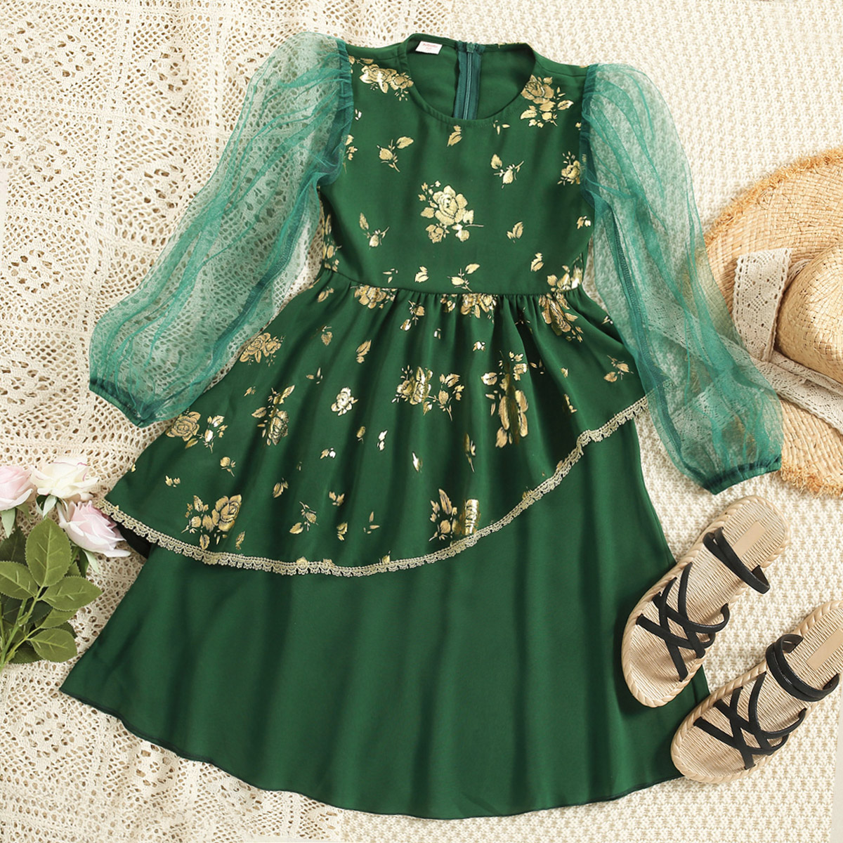 Kid Girl Rose Print Mesh Dress Wholesale