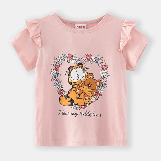 hibobi x Garfield Toddler Girl Basic Cotton Cartoon Ruffle Print Pink T-shirt Wholesale