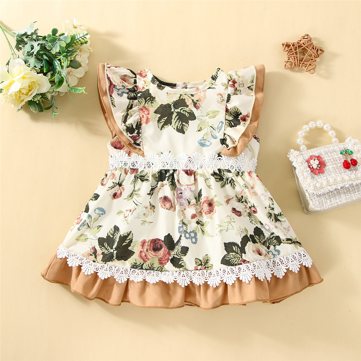 Baby Girl Floral Pattern Lace Decoration Ruffle-sleeve Dress Wholesale