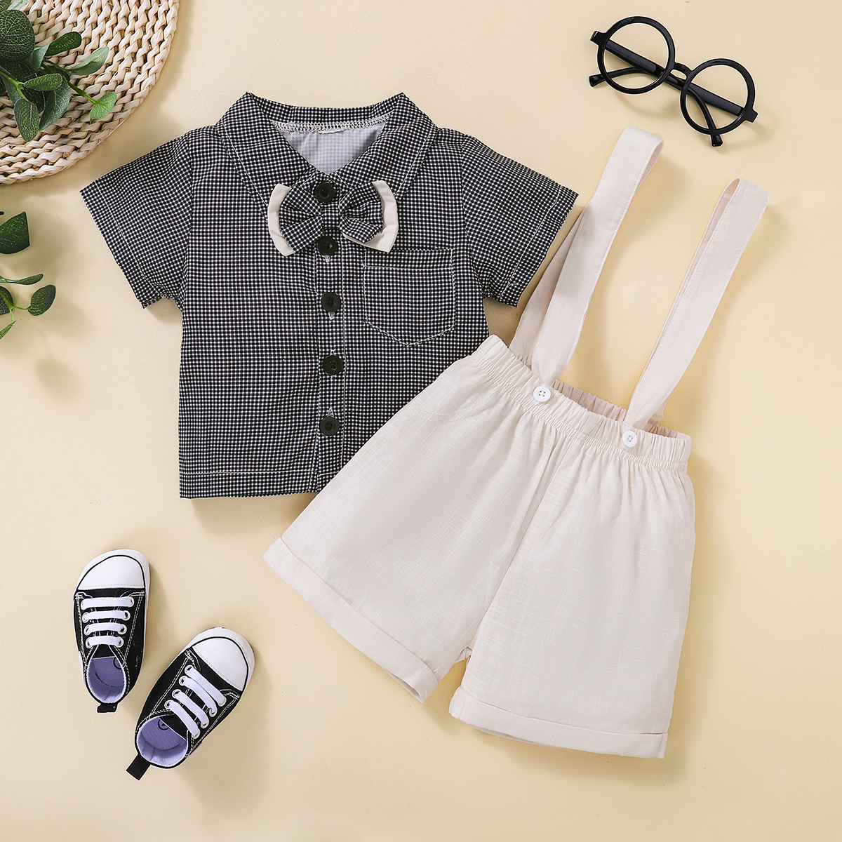 Baby Boy Gentleman Plaid Pattern Bow-knot Shirt & Suspender Shorts Wholesale