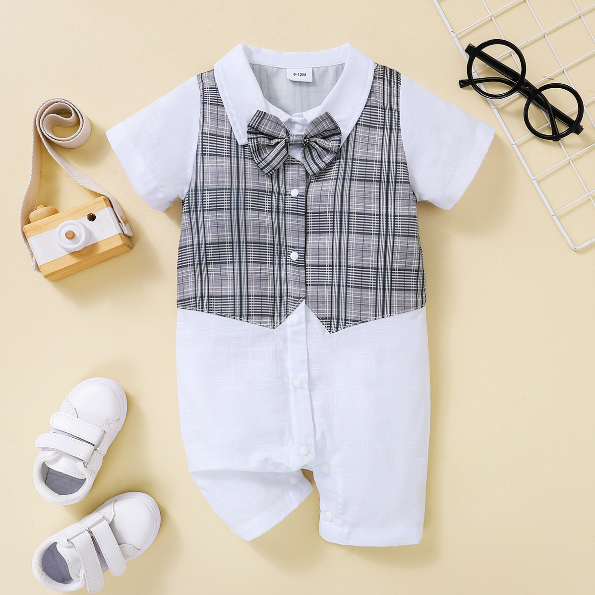 Baby Boy Gentleman Color-block Plaid Pattern Bow-knot Decoration Romper Wholesale