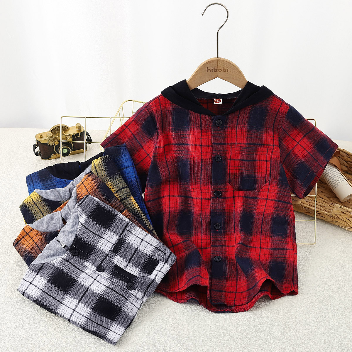 Boy Summer Short Sleeve Plaid Hooded Shirt Wholesale