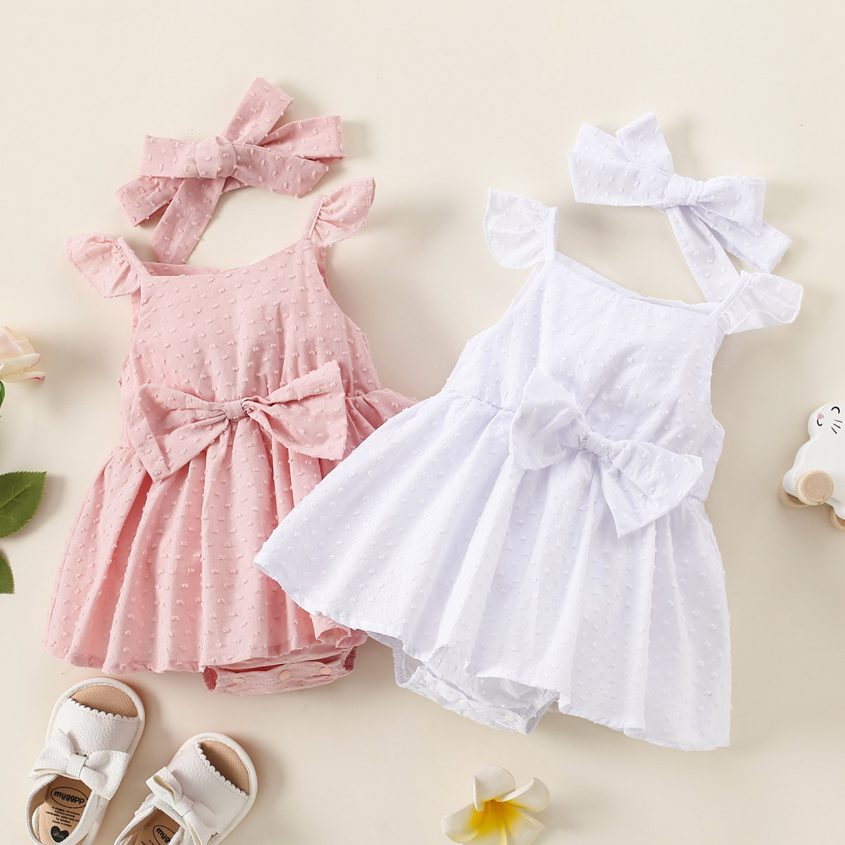 hibobi Girl Baby Solid Bowknot Halter Dress Bodysuit & Headbands Wholesale