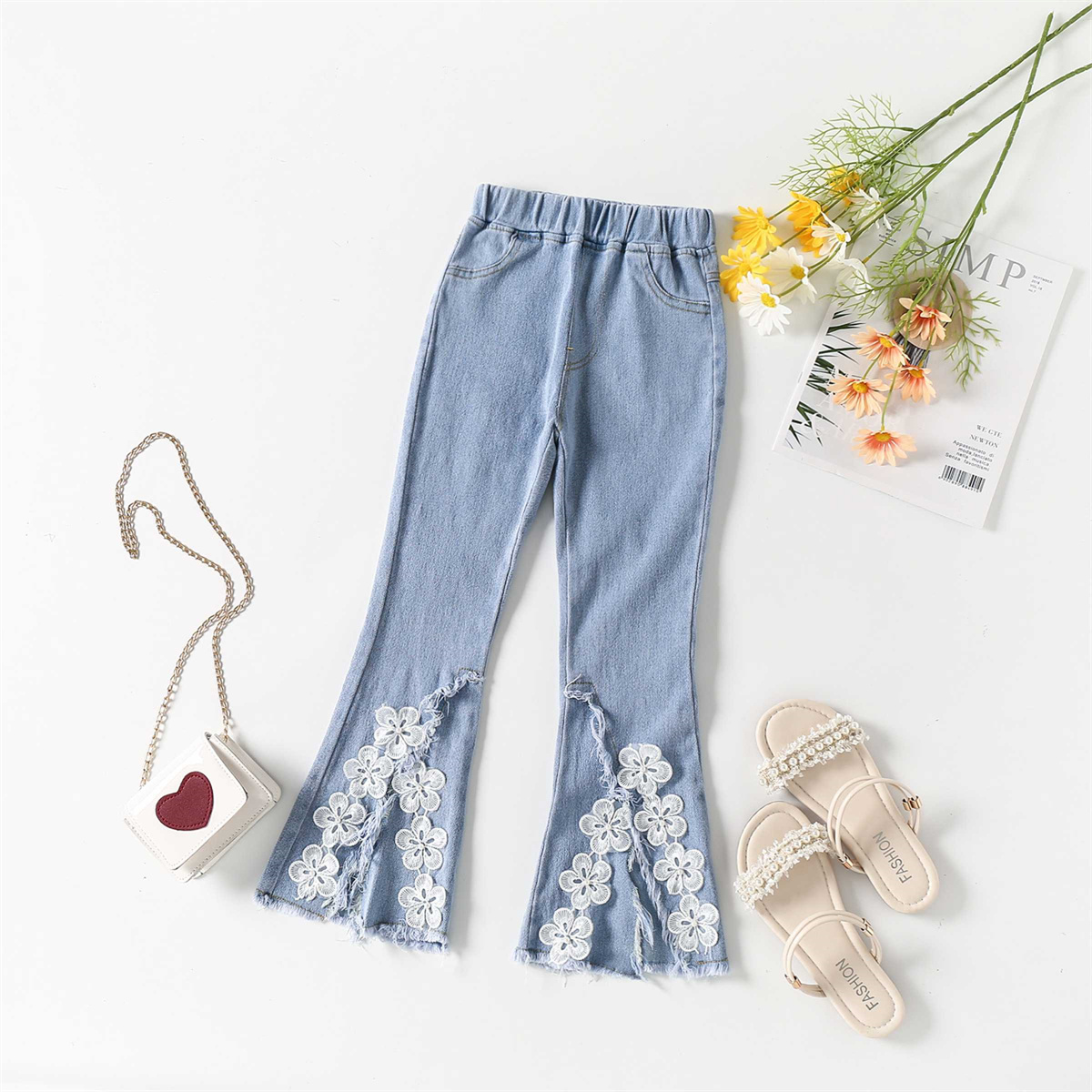 Kids Girls Sweet Lace Flowers Tassels Slit Denim Flare Pants Wholesale