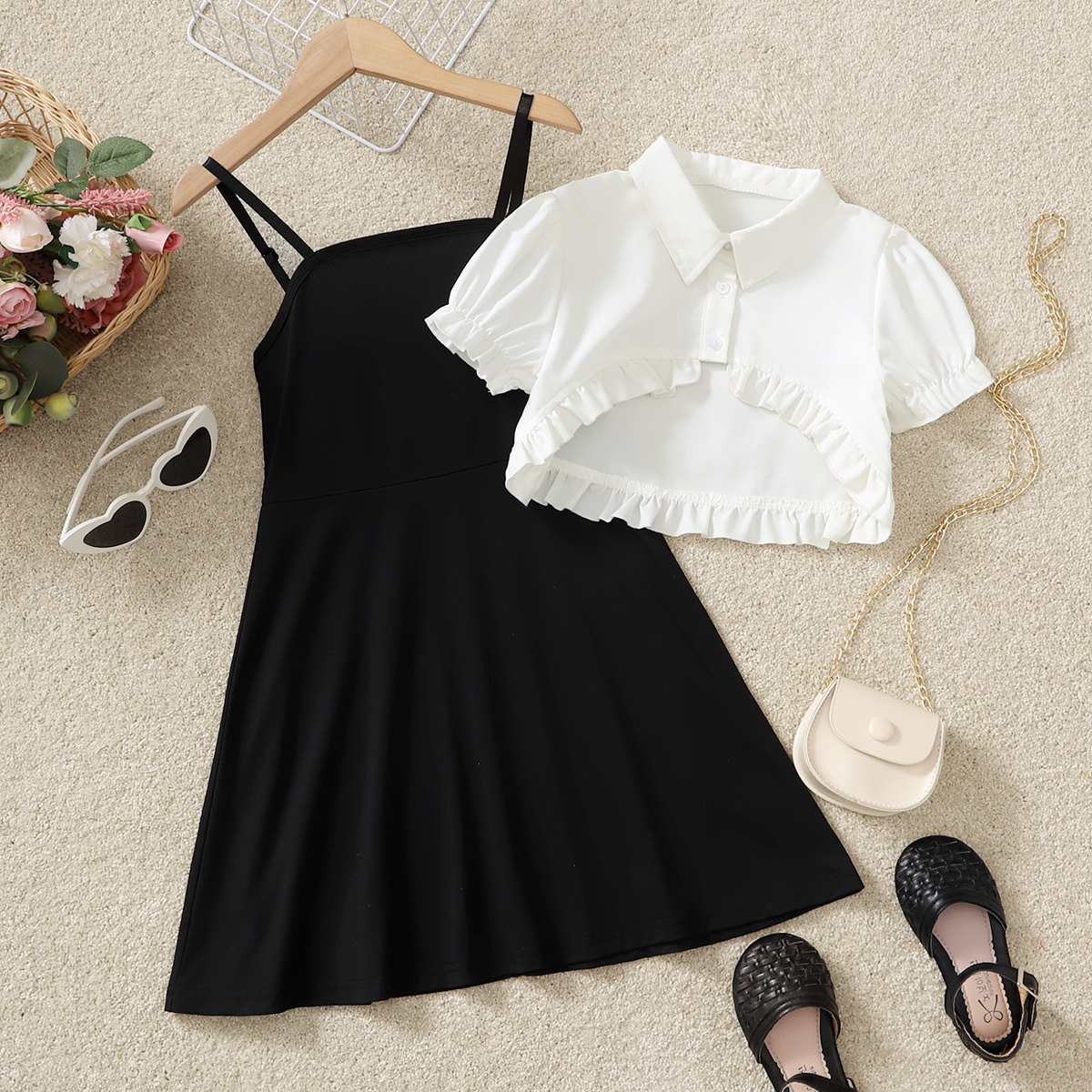 Kids Girls Summer Solid Slip Dress Puff Sleeve Shirt Jacket Two Piece Set Wholesale