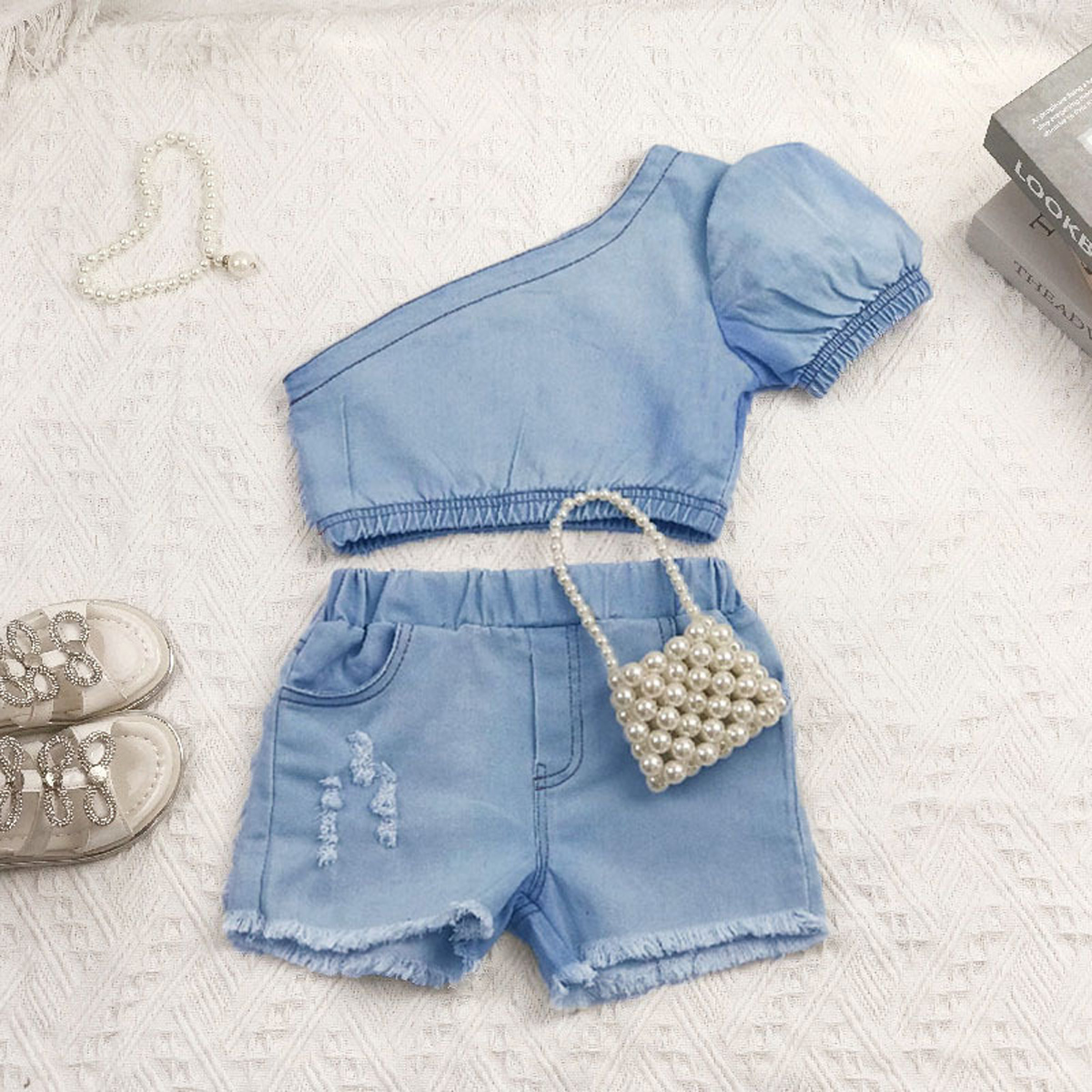 Toddler Girl Edgy Solid One Shoulder Jeans Top & Shorts Wholesale