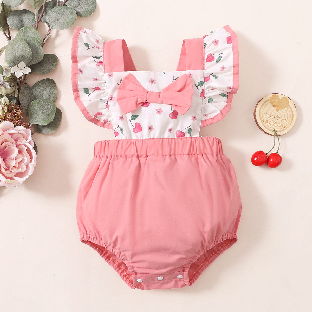 Baby Girl Color-block Ruffle-sleeve Floral Cherry Pattern Bow-knot Bodysuit Wholesale