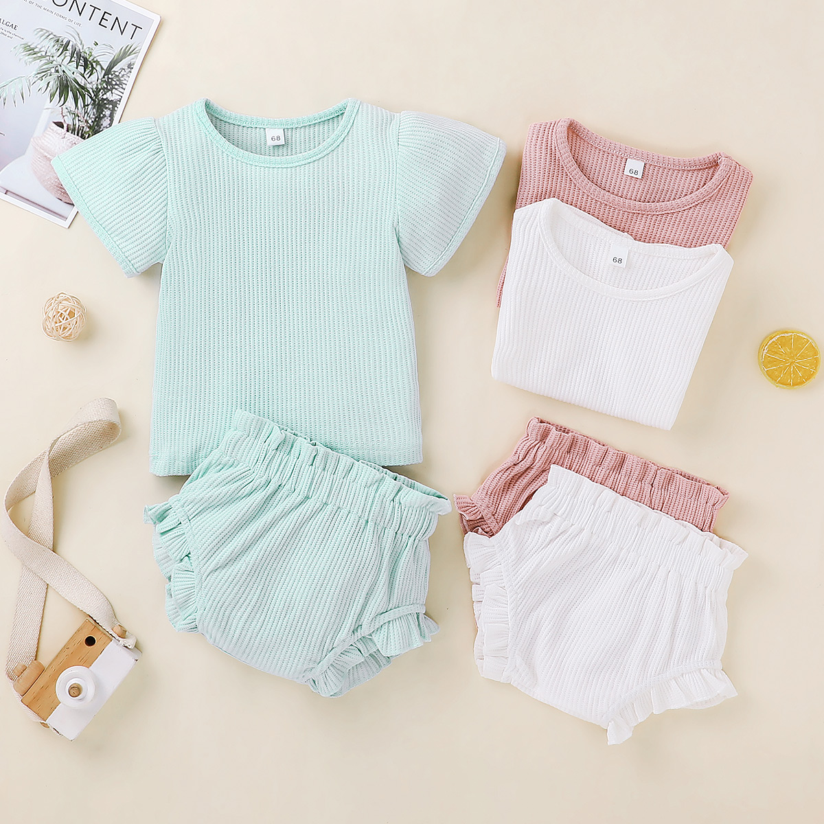 Baby Girl Solid Colour Puff Sleeve Top And Shorts Wholesale