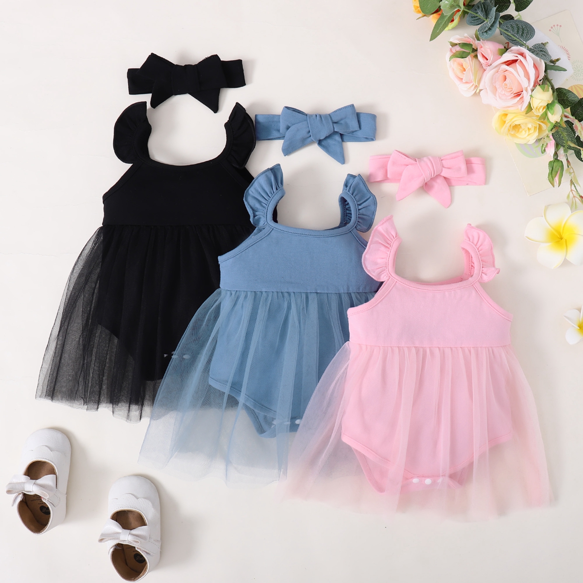 Baby Girl Sweet Sling Solid Colour Mesh Bodysuit with Headband Wholesale