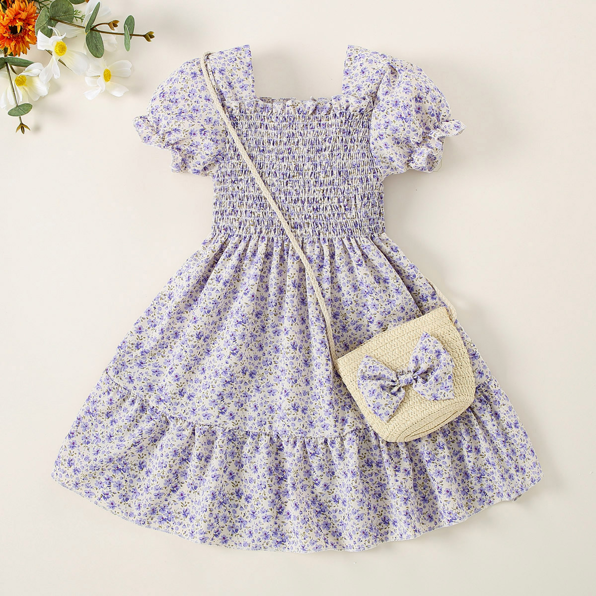 Toddler Girls Floral Smocking Puff Sleeve Top Dress Wholesale