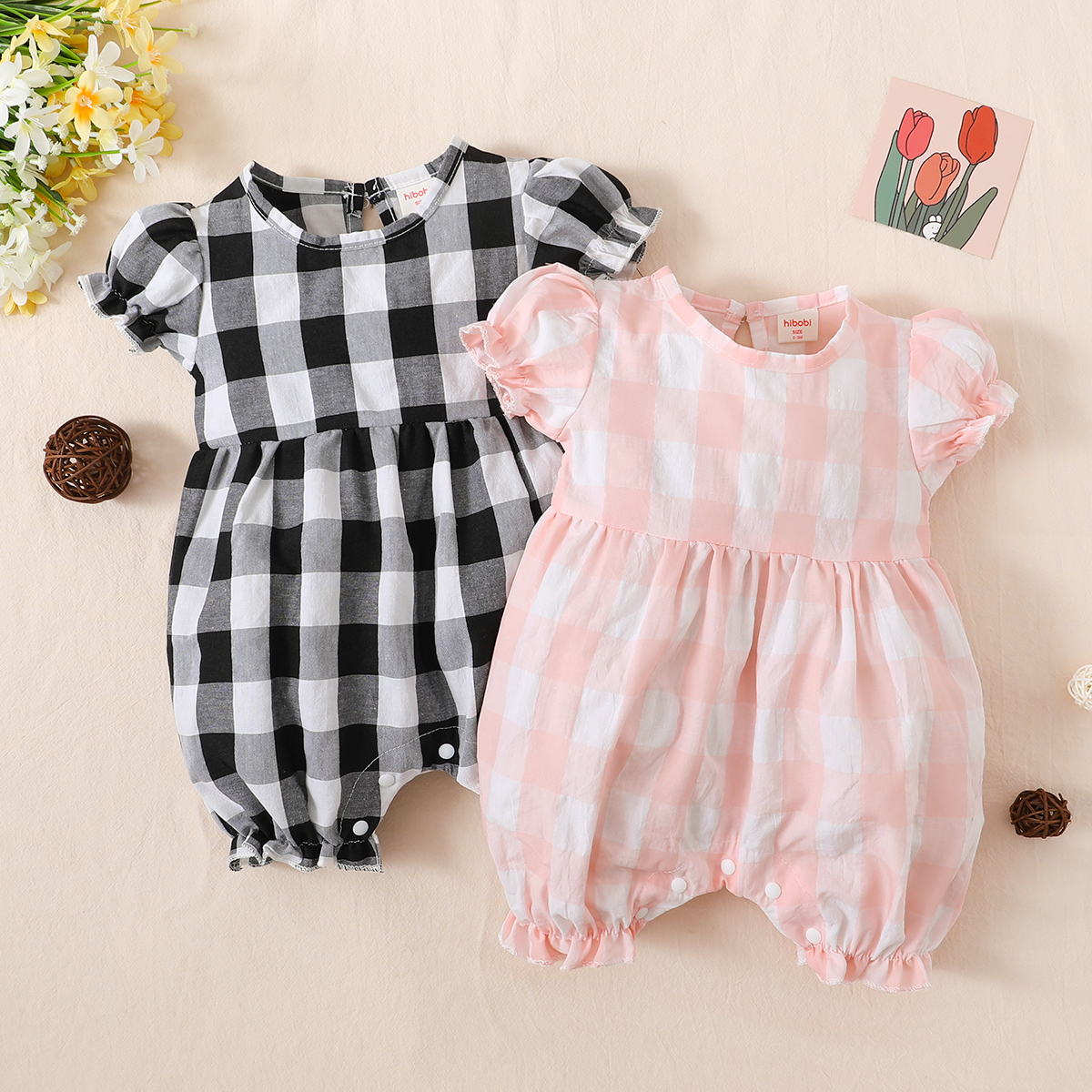 hibobi baby girl bubble sleeve plaid cotton jumpsuit Wholesale