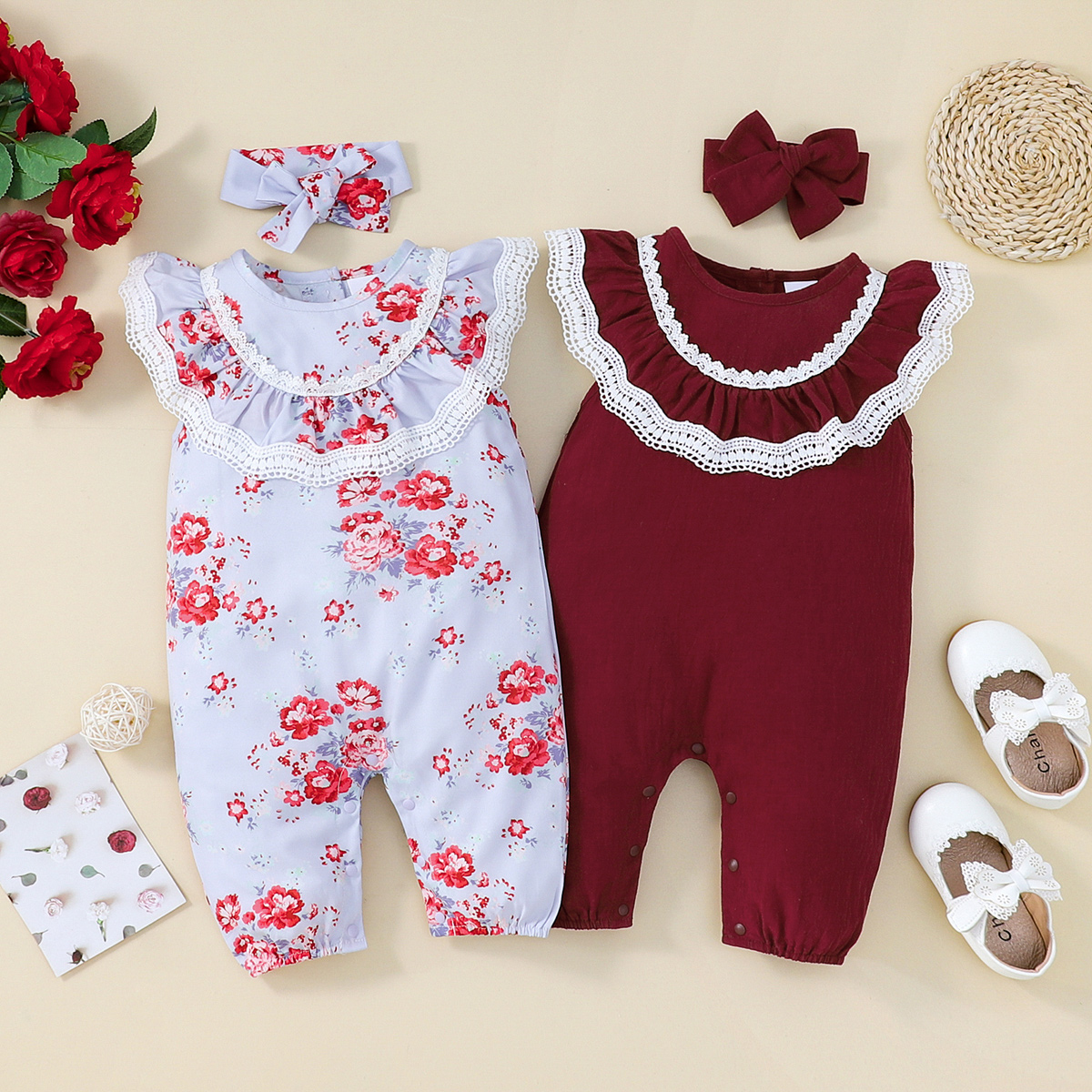 hibobi Girl Baby White Lace Floral Print Sleeveless Jumpsuit & Headband Wholesale