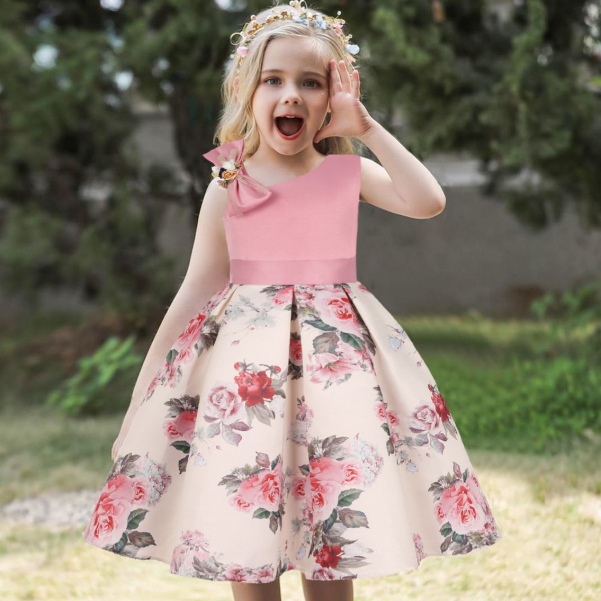 Toddler Girls Open Shoulder Cute Bow Print Formal Dress Wholesale