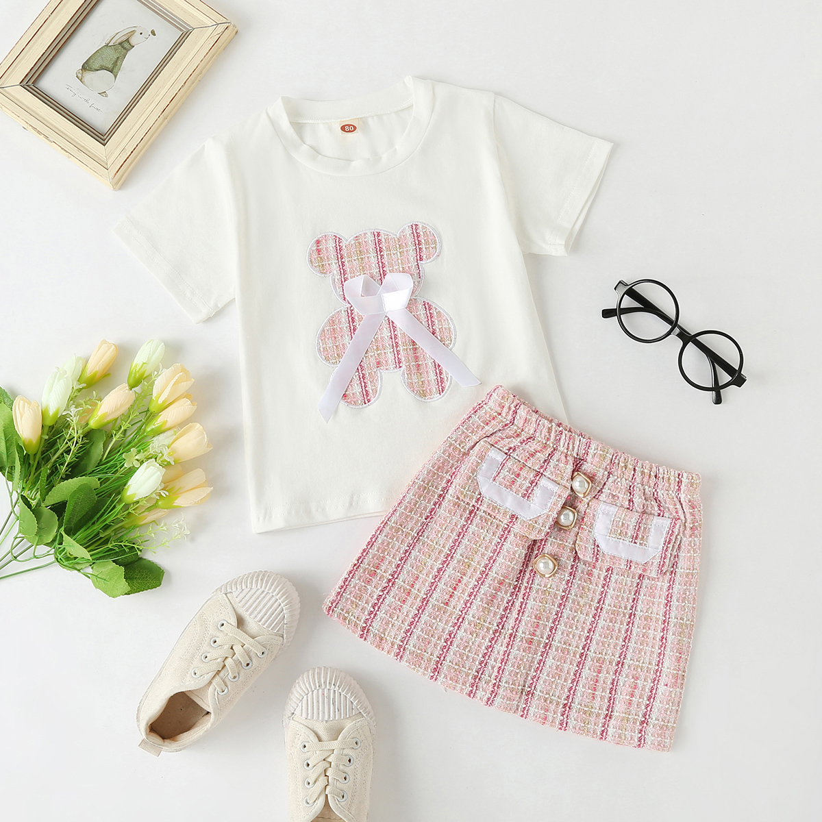 Toddler Girls Elegant Bear Appliqué Top & Skirt Wholesale
