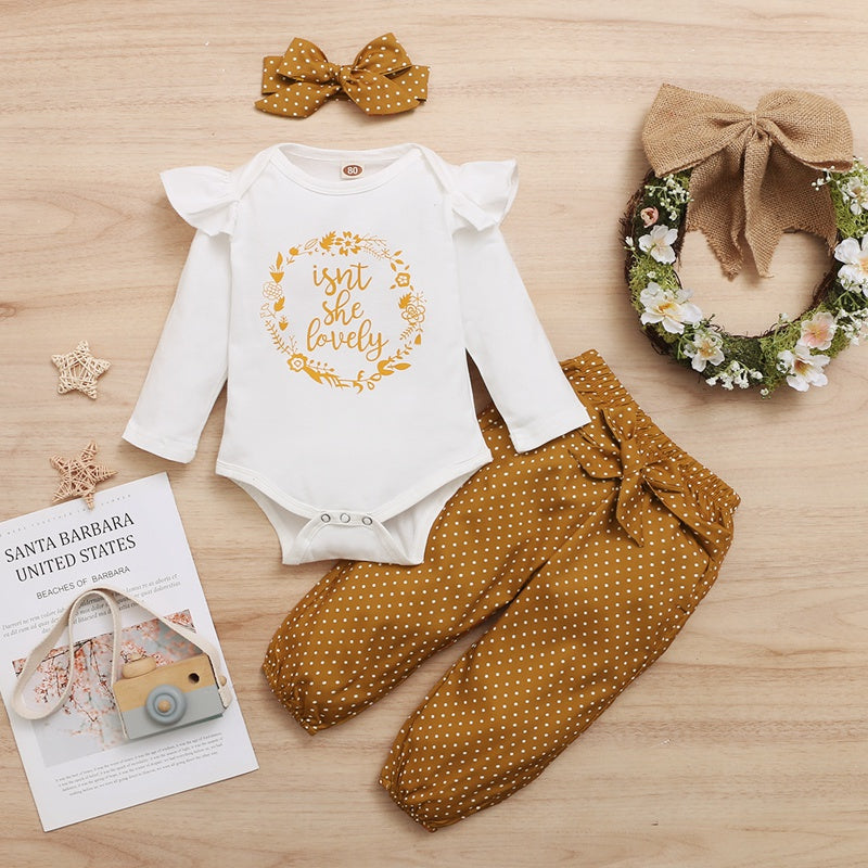 Baby Girl Sweet Ruffle Letter Print Romper Polka-dot Pant Headband Three-piece Wholesale