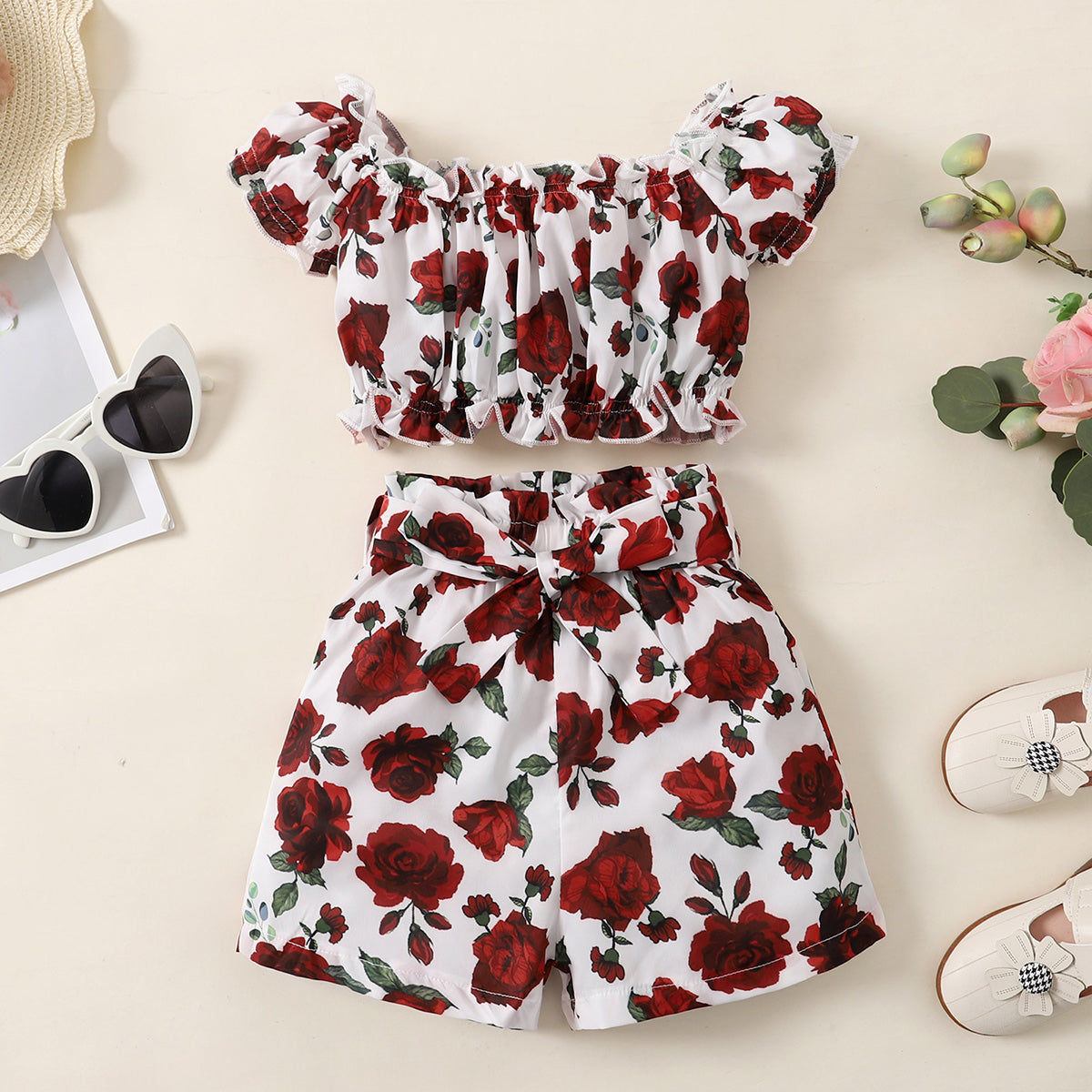 Toddler Girls Slash Neck Floral Ruffled Sleeve Top & Shorts Wholesale