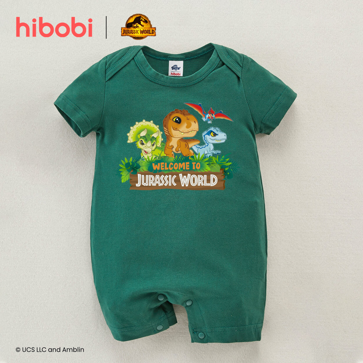 Jurassic World × hibobi boy baby Dinosaur Print Green Sleeve Bodysuit Wholesale