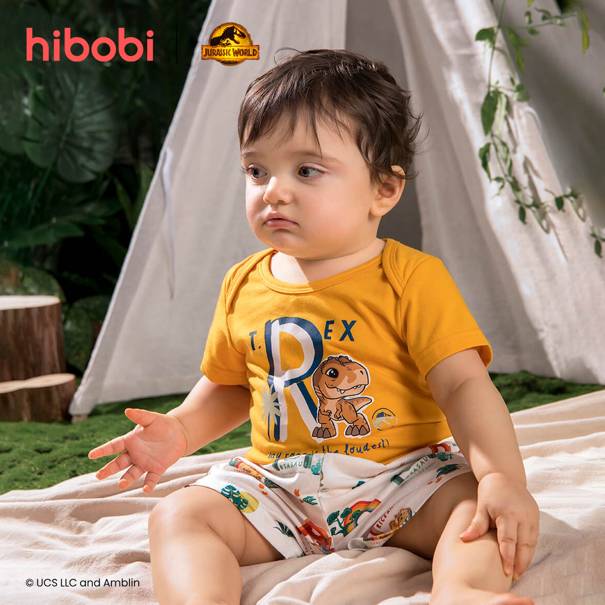 Jurassic World × hibobi boy baby Dinosaur Print Yellow Bodysuit Set Wholesale