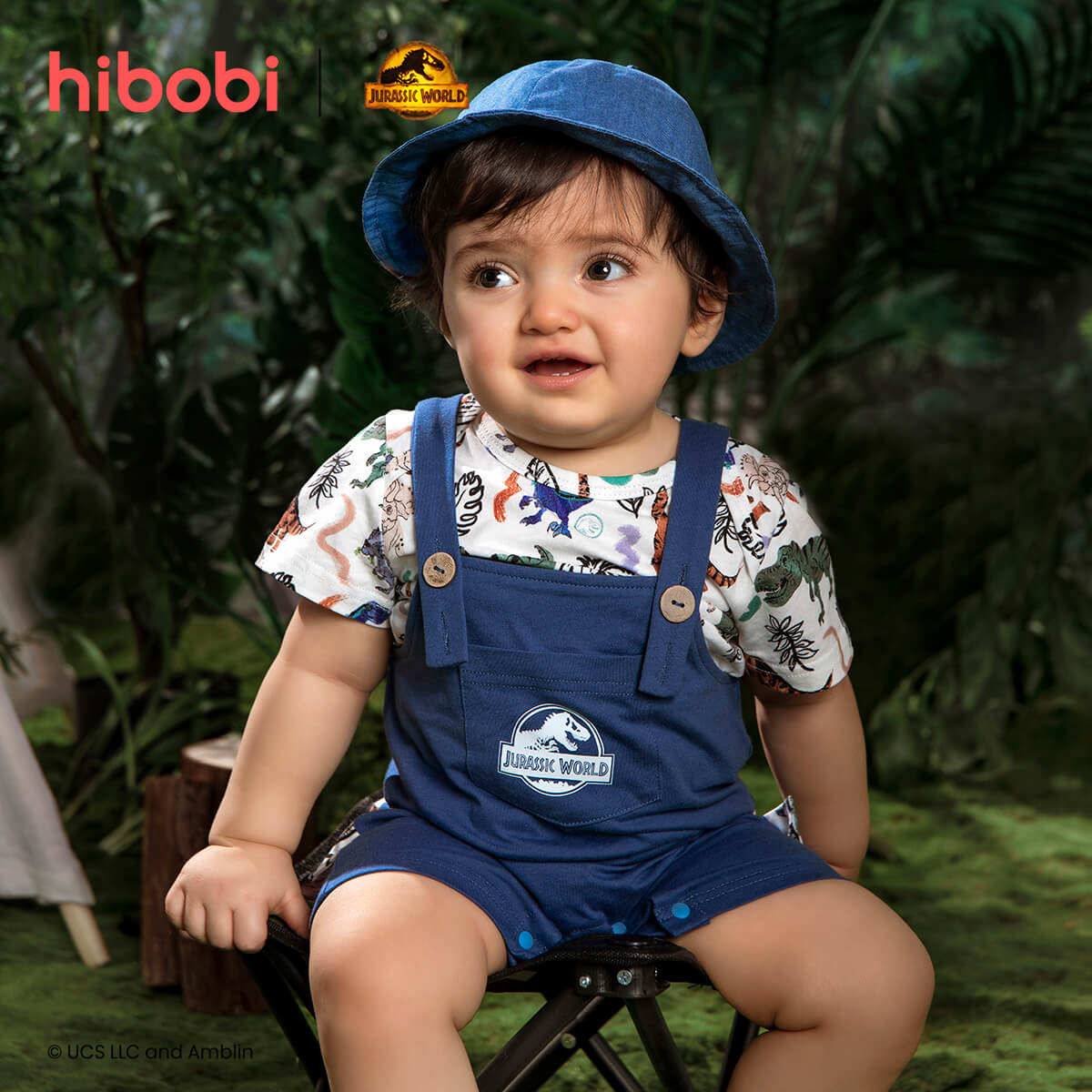 Jurassic World × hibobi boy baby Dinosaur Print Blue Strappy Trousers Suit Wholesale
