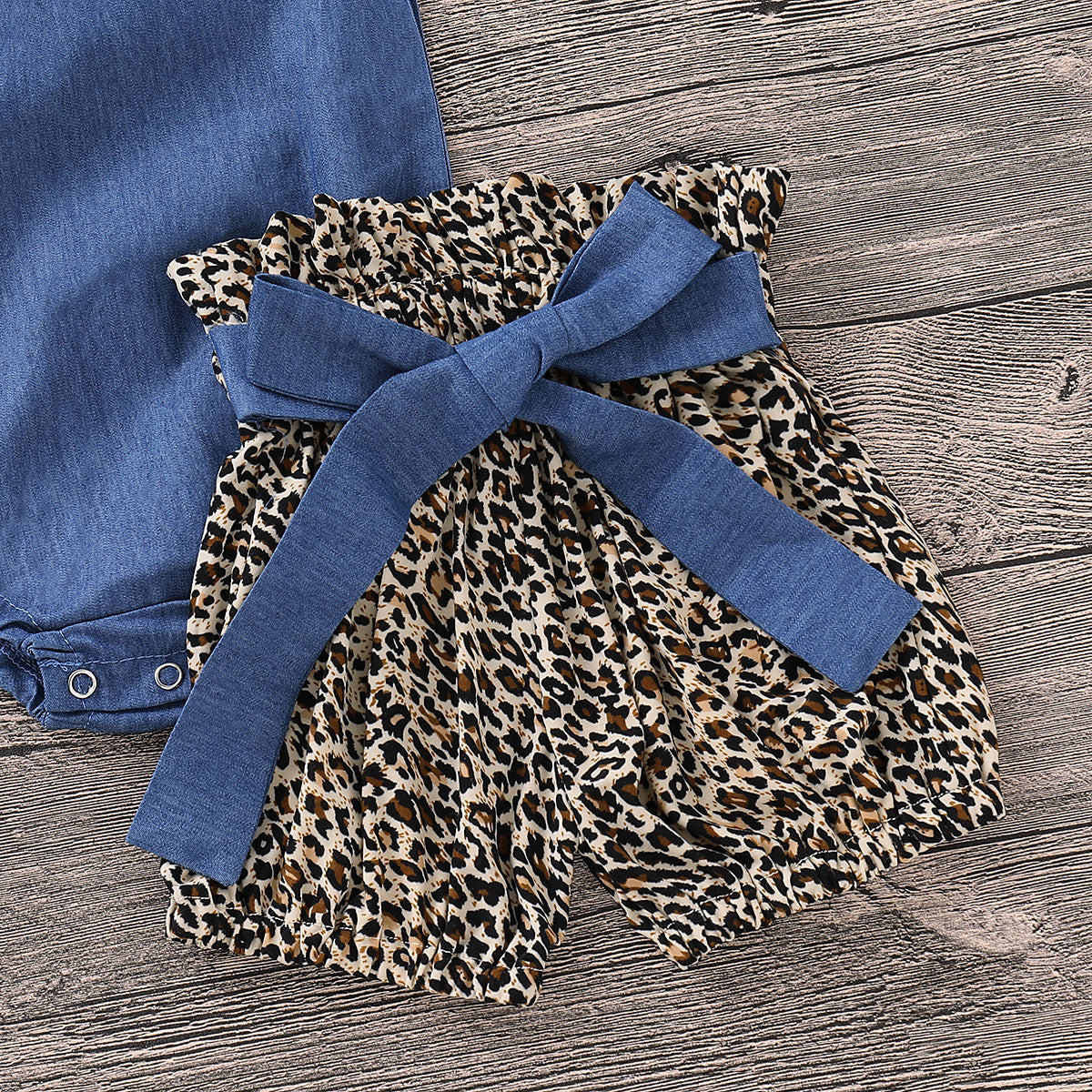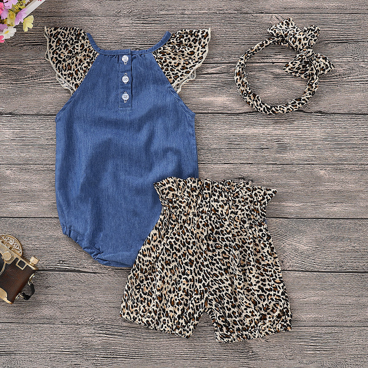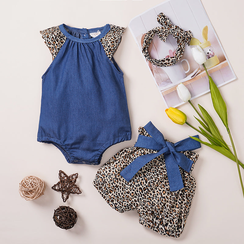 3-piece Blue Romper, Leopard Pants and Headband Set for Baby Girl Wholesale