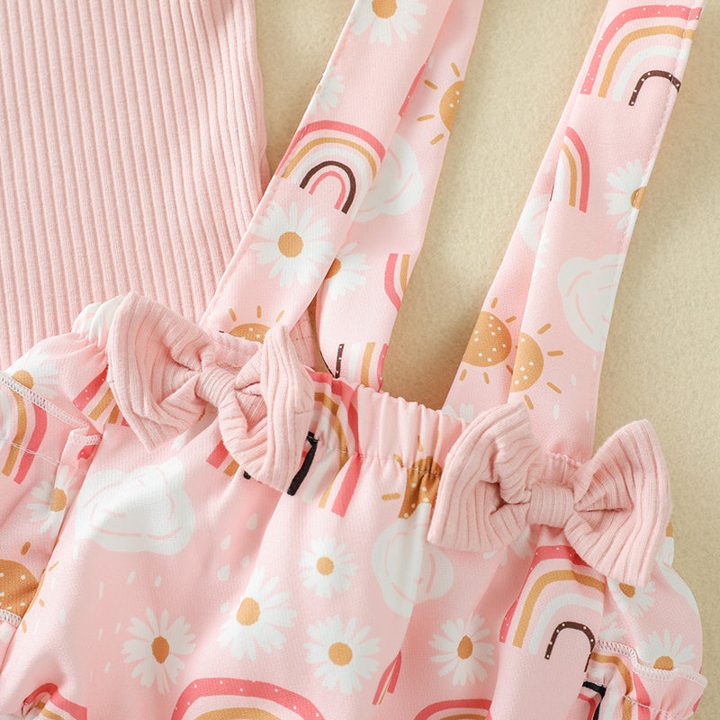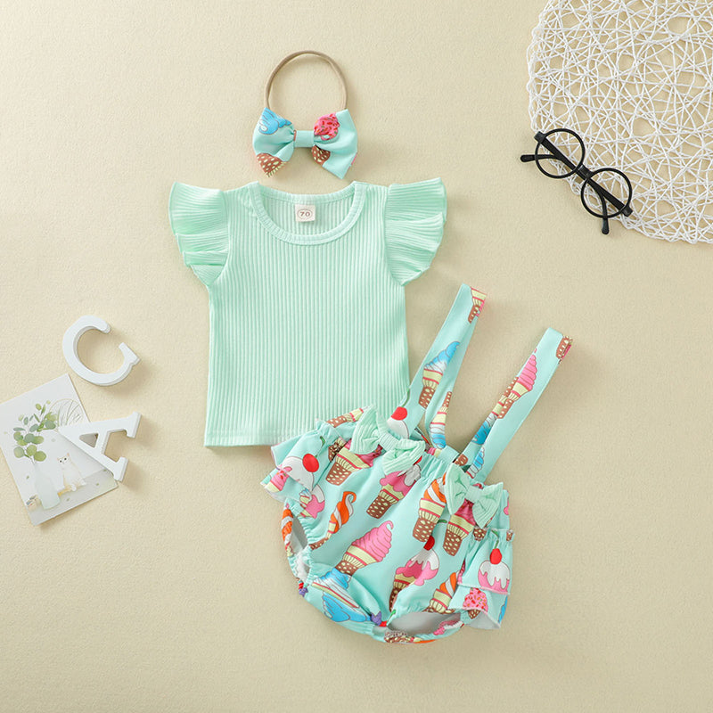 Baby Girl Ribbed Ruffle Sleeves Top & Suspender Skirt & Bow Headband Wholesale