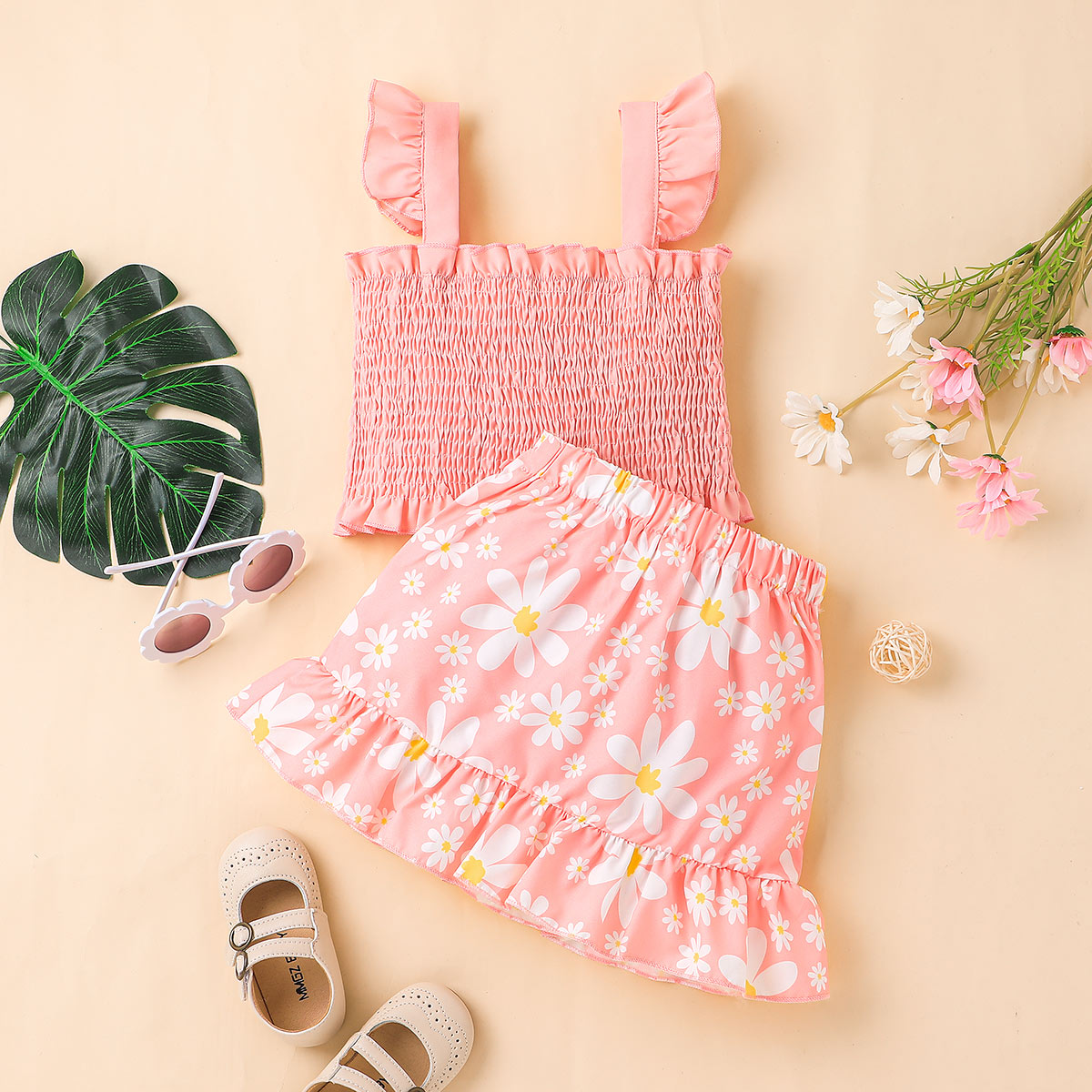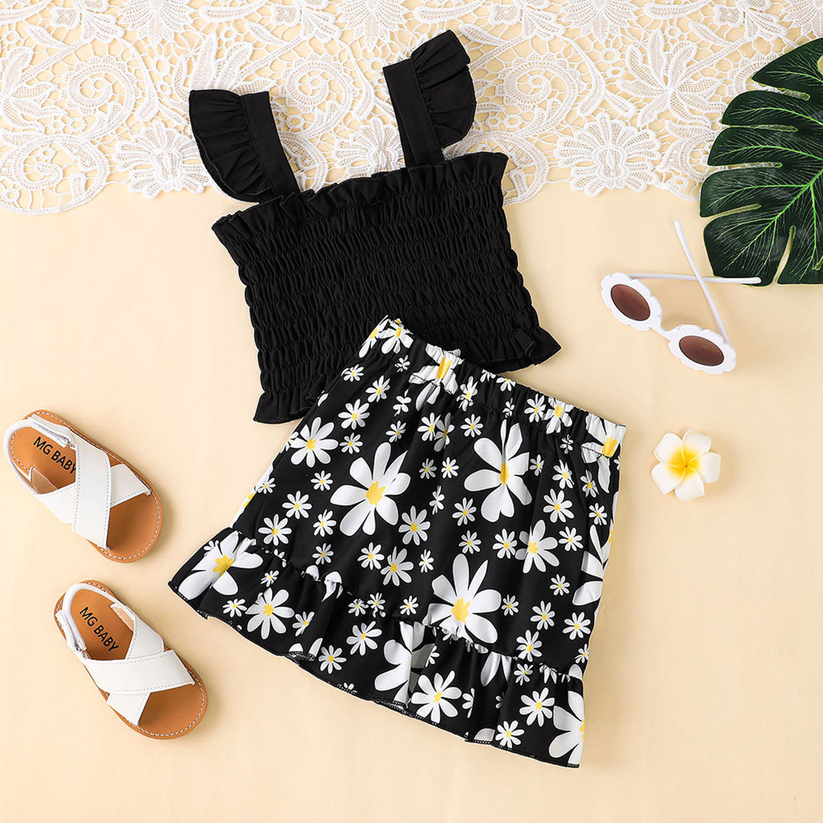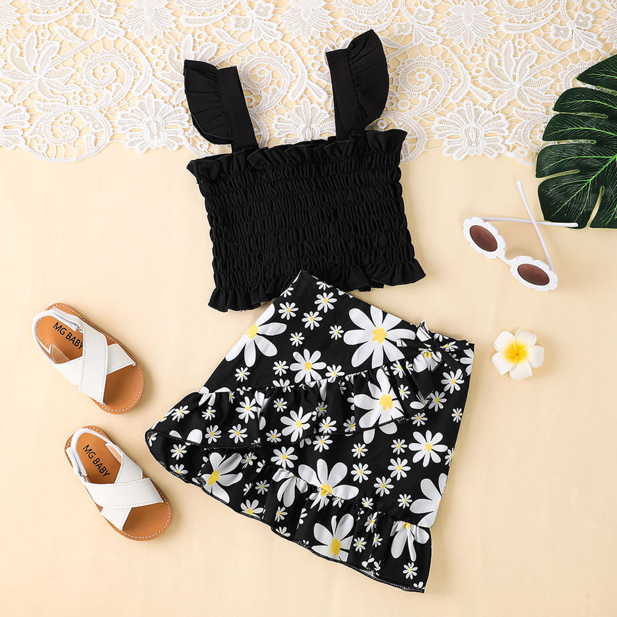 Toddler Girl Sweet Cute Ruffle Daisy Vest Top & Skirt Wholesale