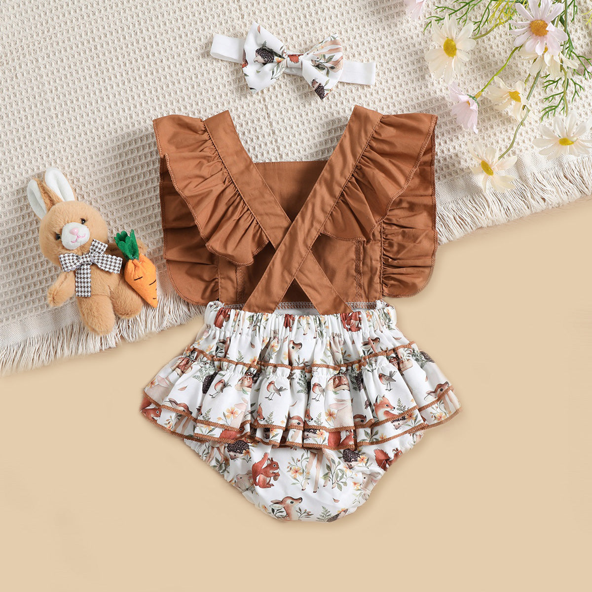 Baby Girl Color-Block Letter Floral Ruffle-sleeve Bodysuit & Headband Wholesale