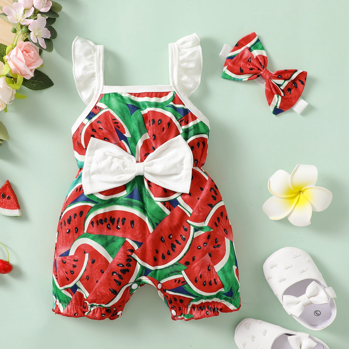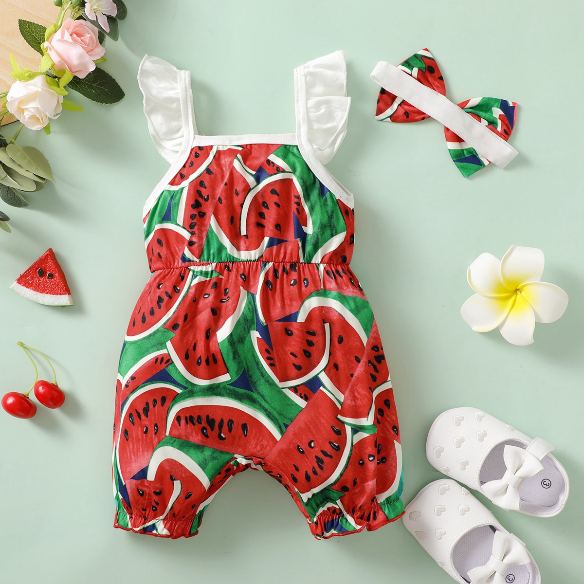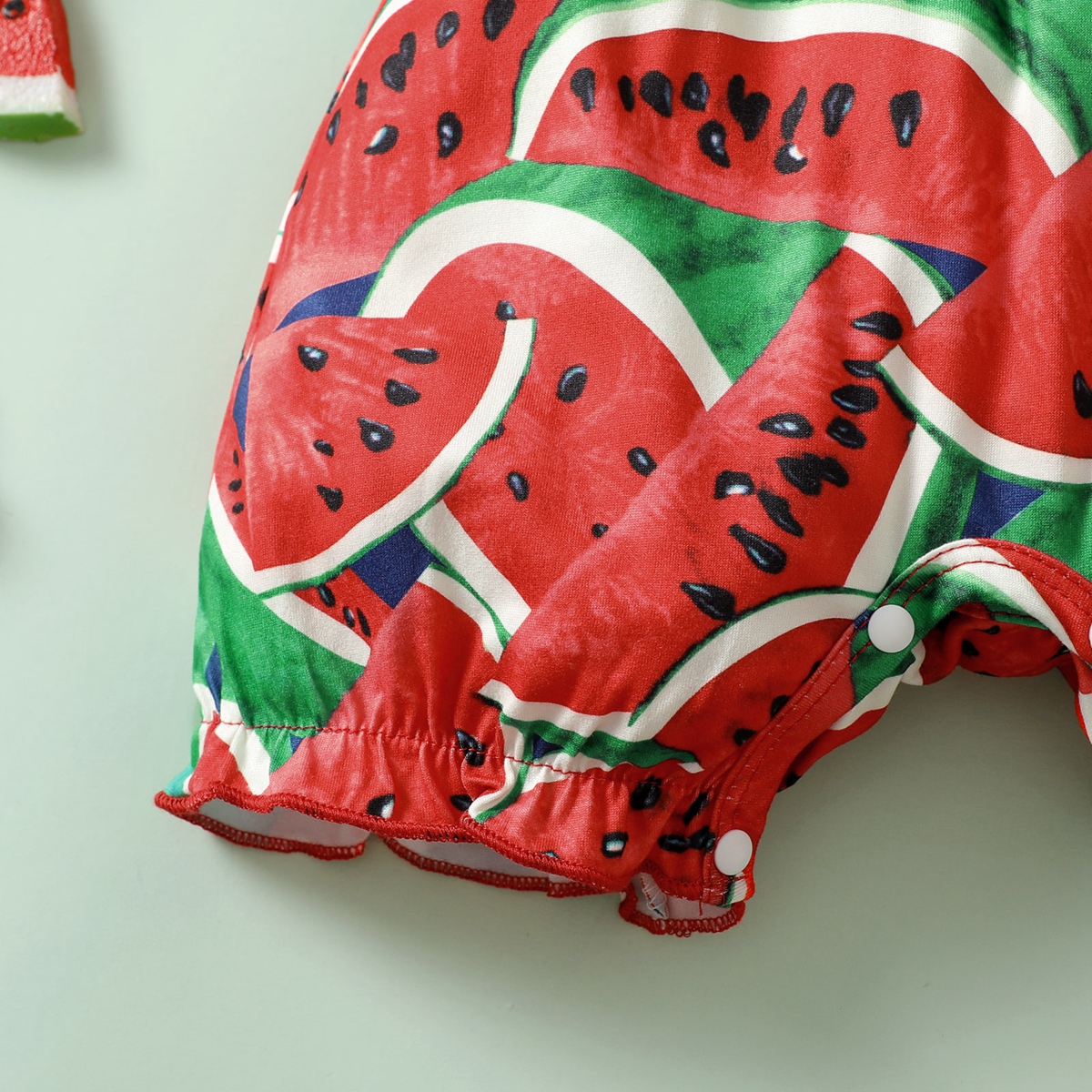Baby Girl Cute Watermelon Ruffle Sleeve Bodysuit with Headband Wholesale