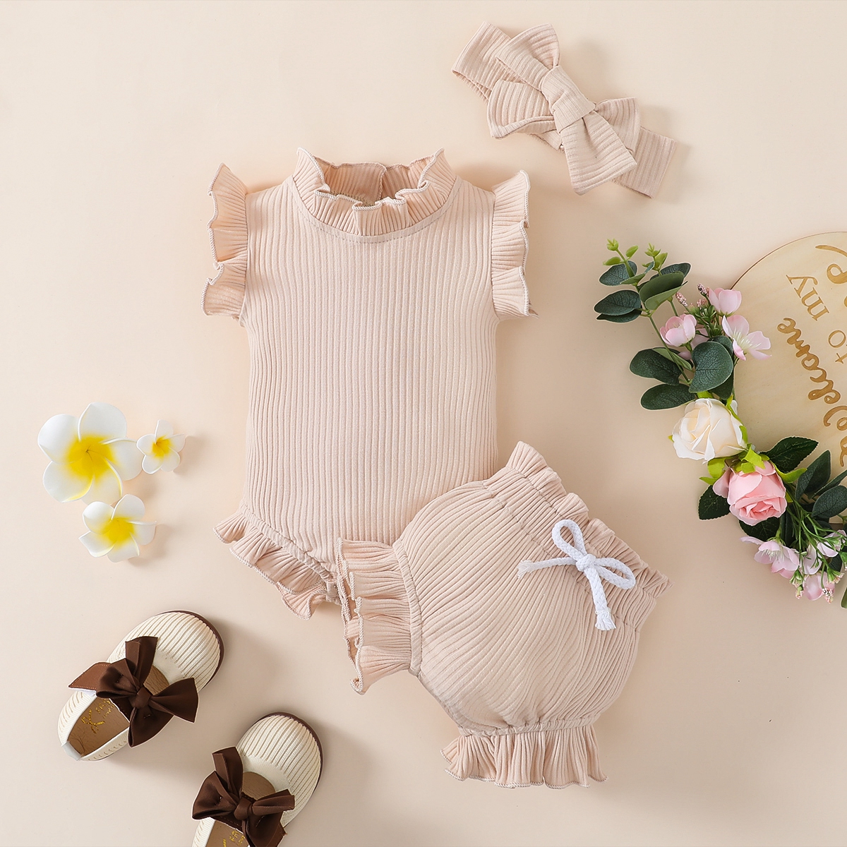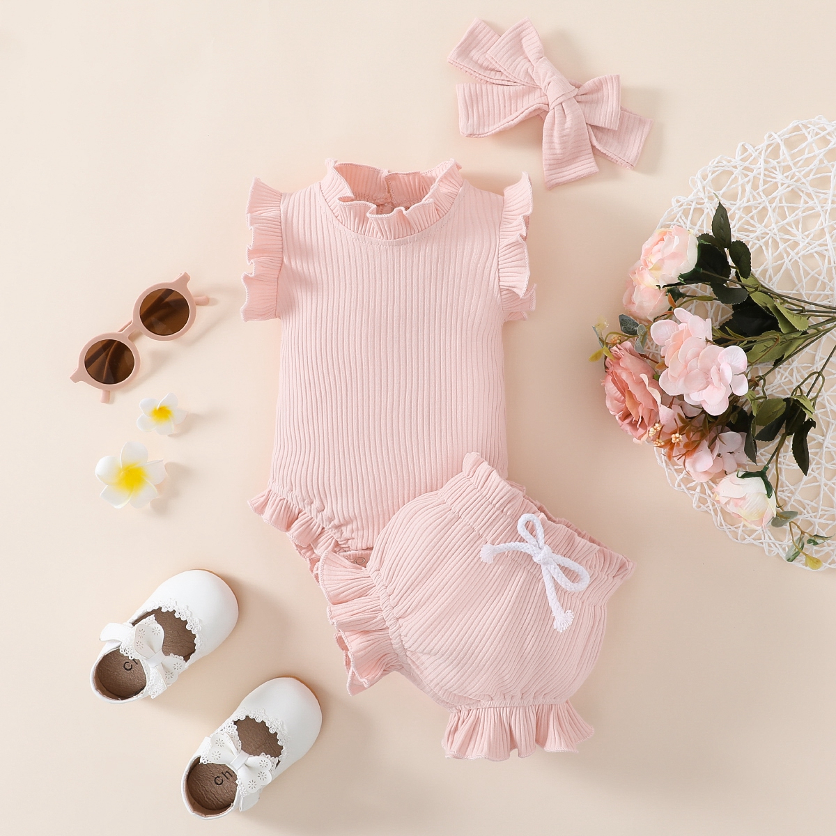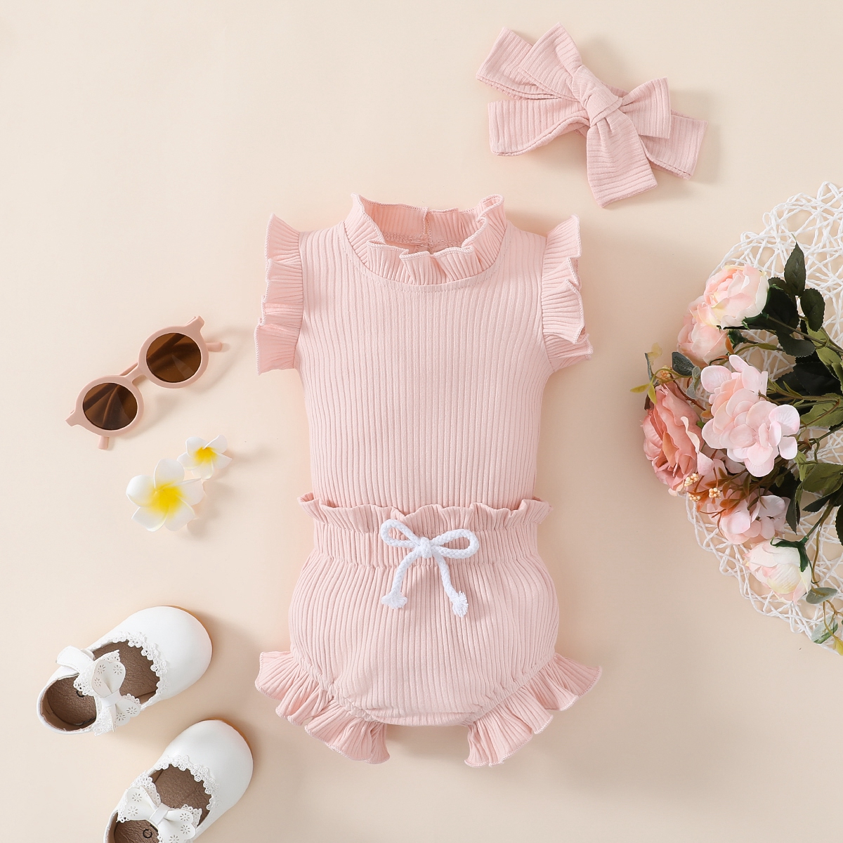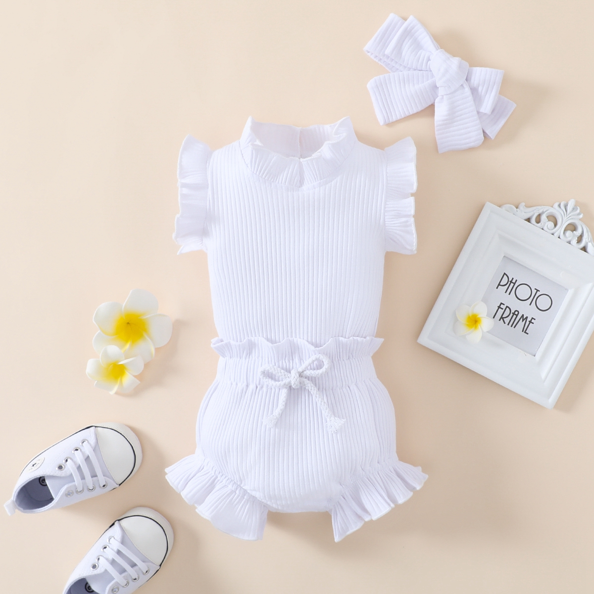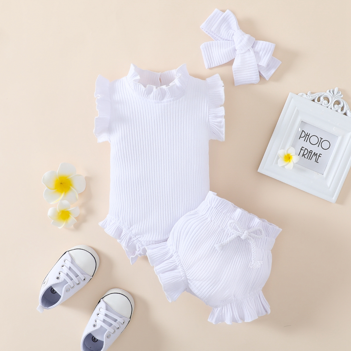 Baby Girl Solid Color Ruffle-sleeve Bodysuit & Shorts & Headband Wholesale