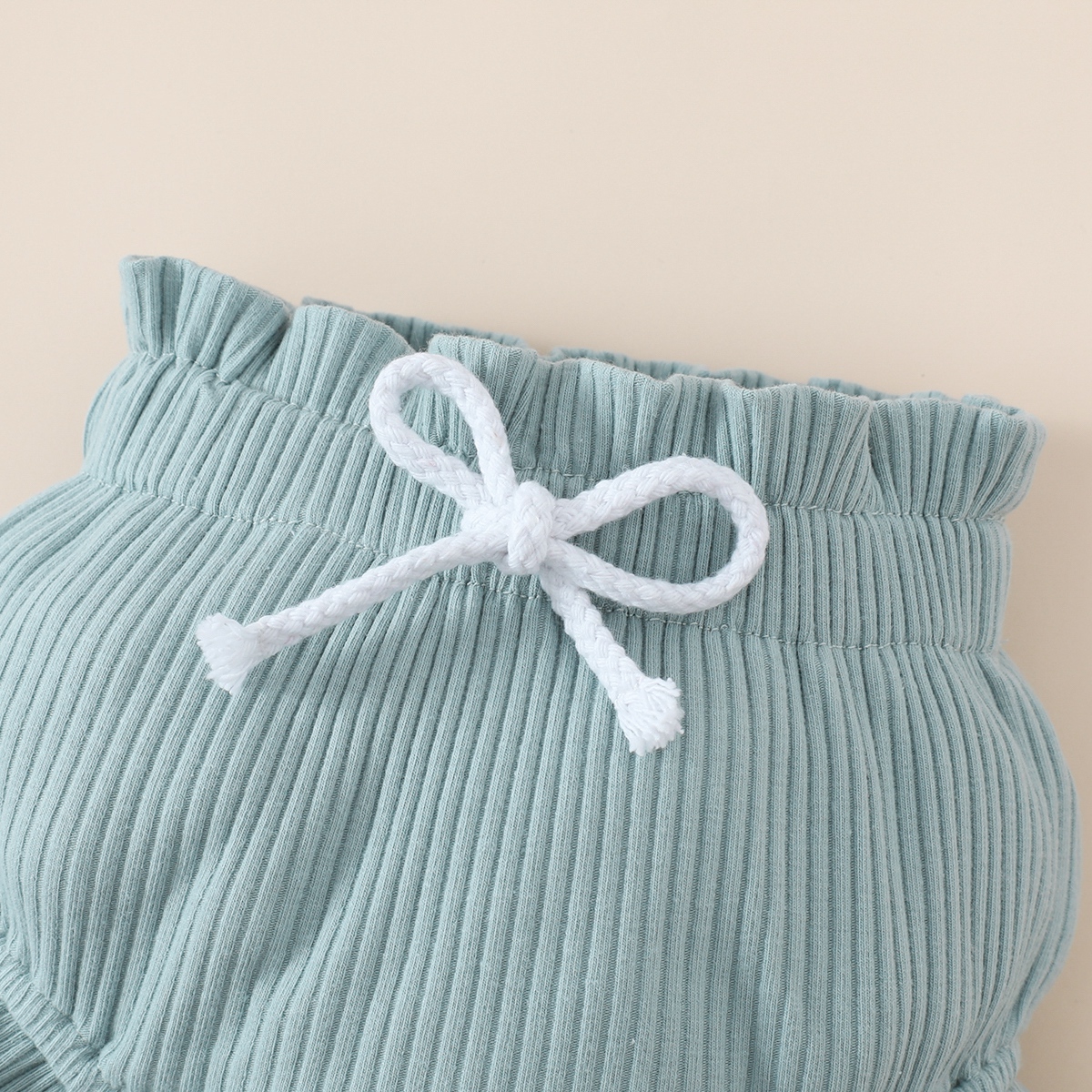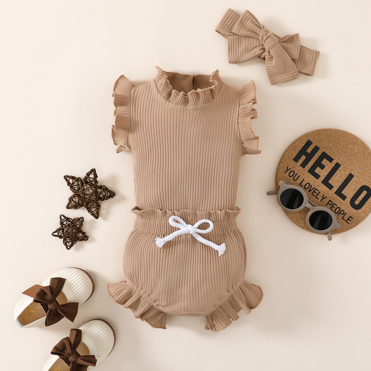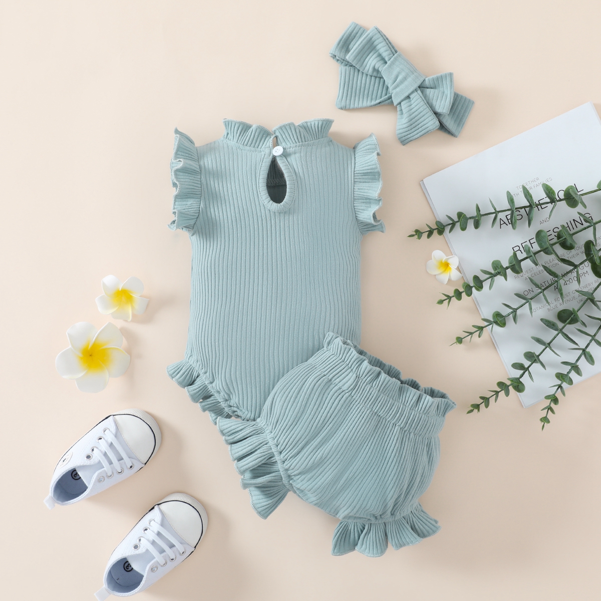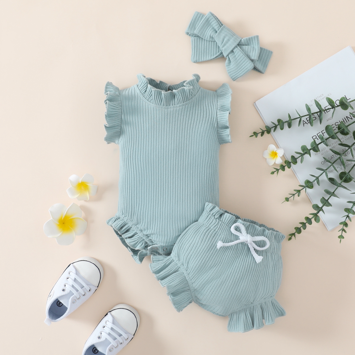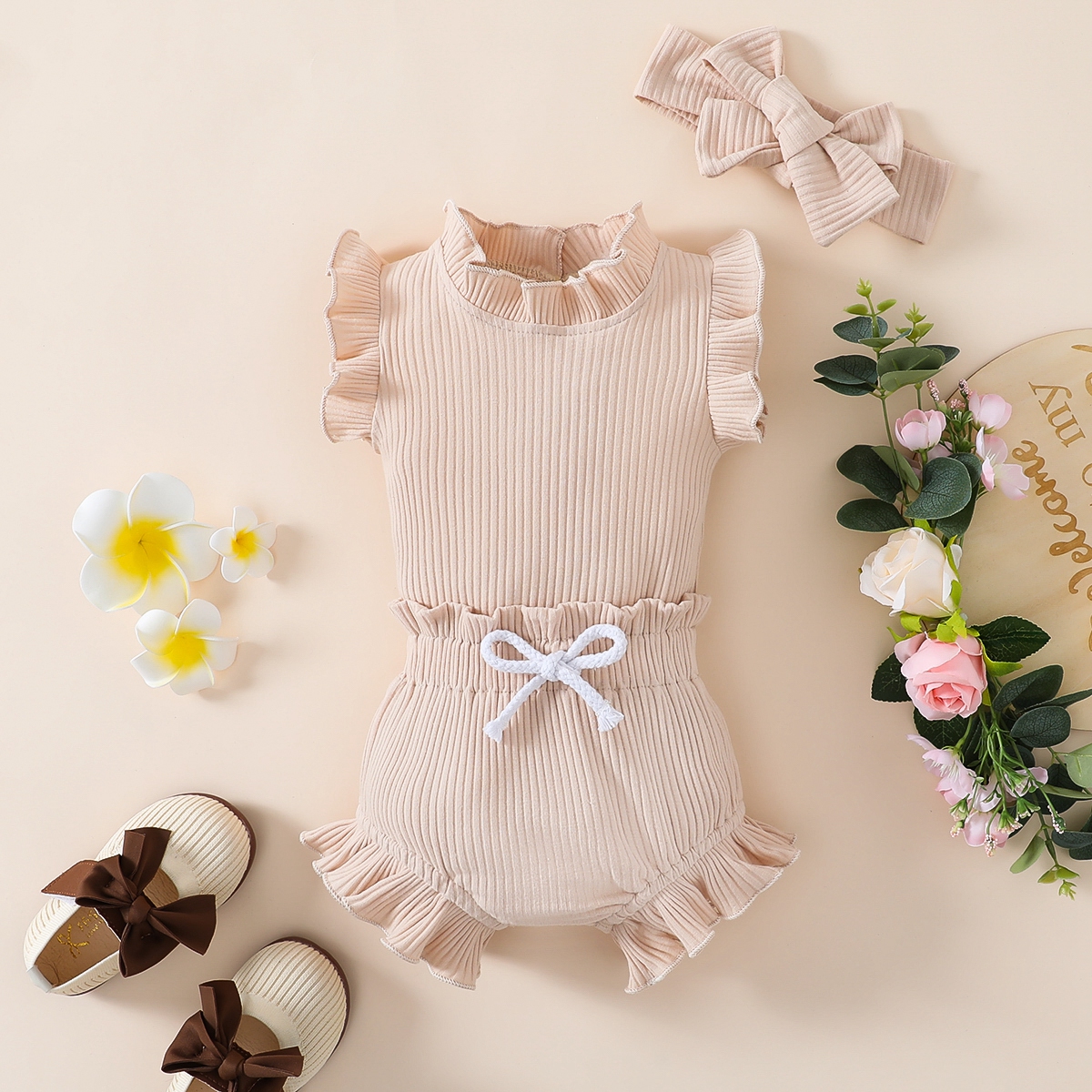 Baby Girl Solid Color Ruffle-sleeve Bodysuit & Shorts & Headband Wholesale