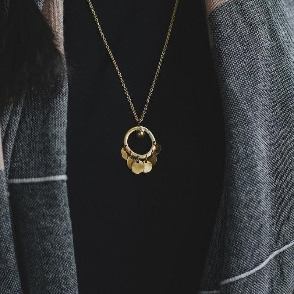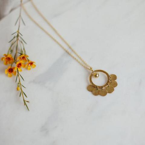 Glam up with the_Brass Medallion Necklace._Handcrafted by women artisans in Nairobi, Kenya, this simple yet statement necklace has equal parts sophistication and global appeal._Make this your everyday piece, or dress up a printed outfit with a few medallions.
