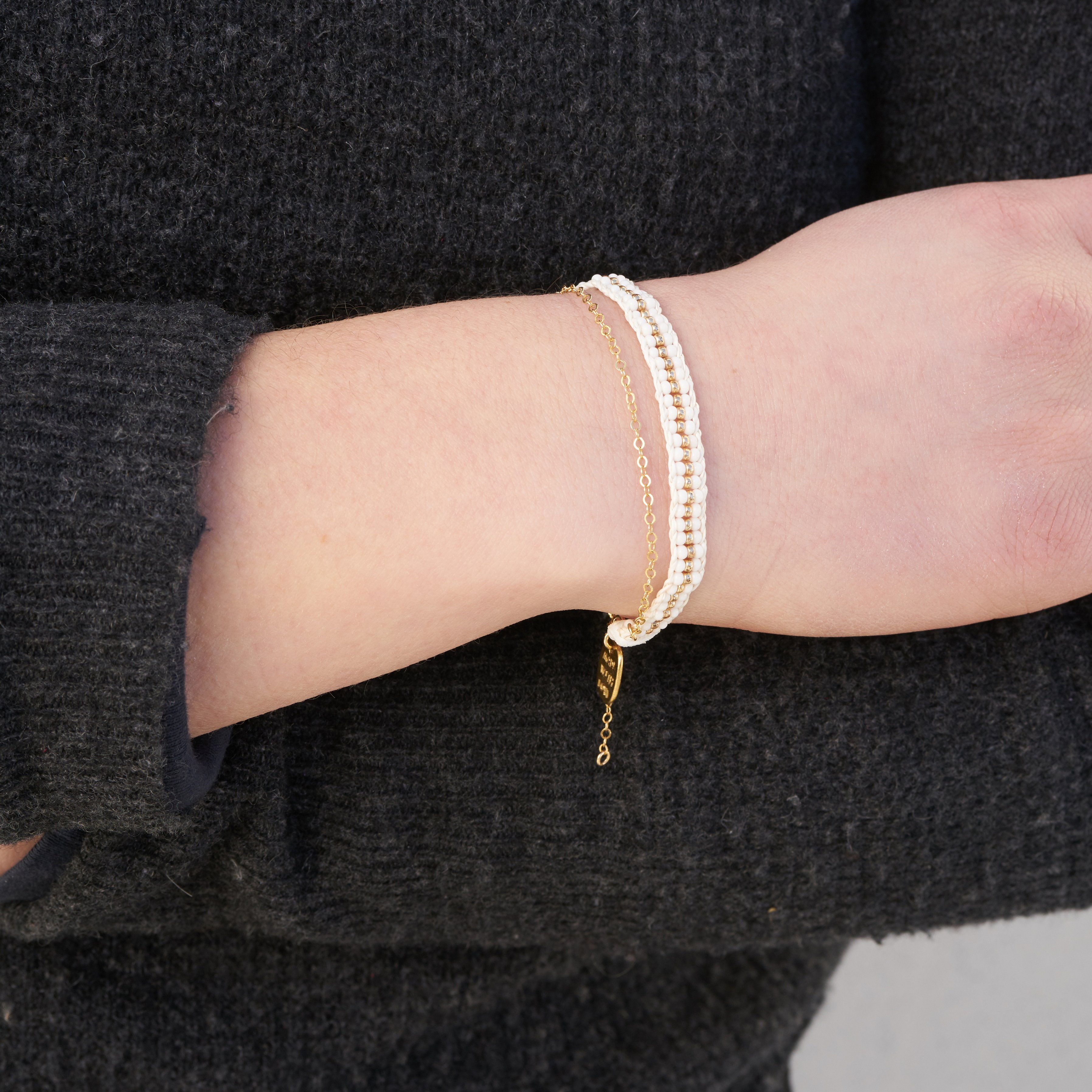 • This beautiful Stripe Warrior Chain Bracelet is an elegant touch to traditional Tanzanian beading. The beaded bracelet fits the wrist with a size-adjustable clasp closure._The gold chain can mimic the loop of the beaded bracelet or hang below as an added loop._