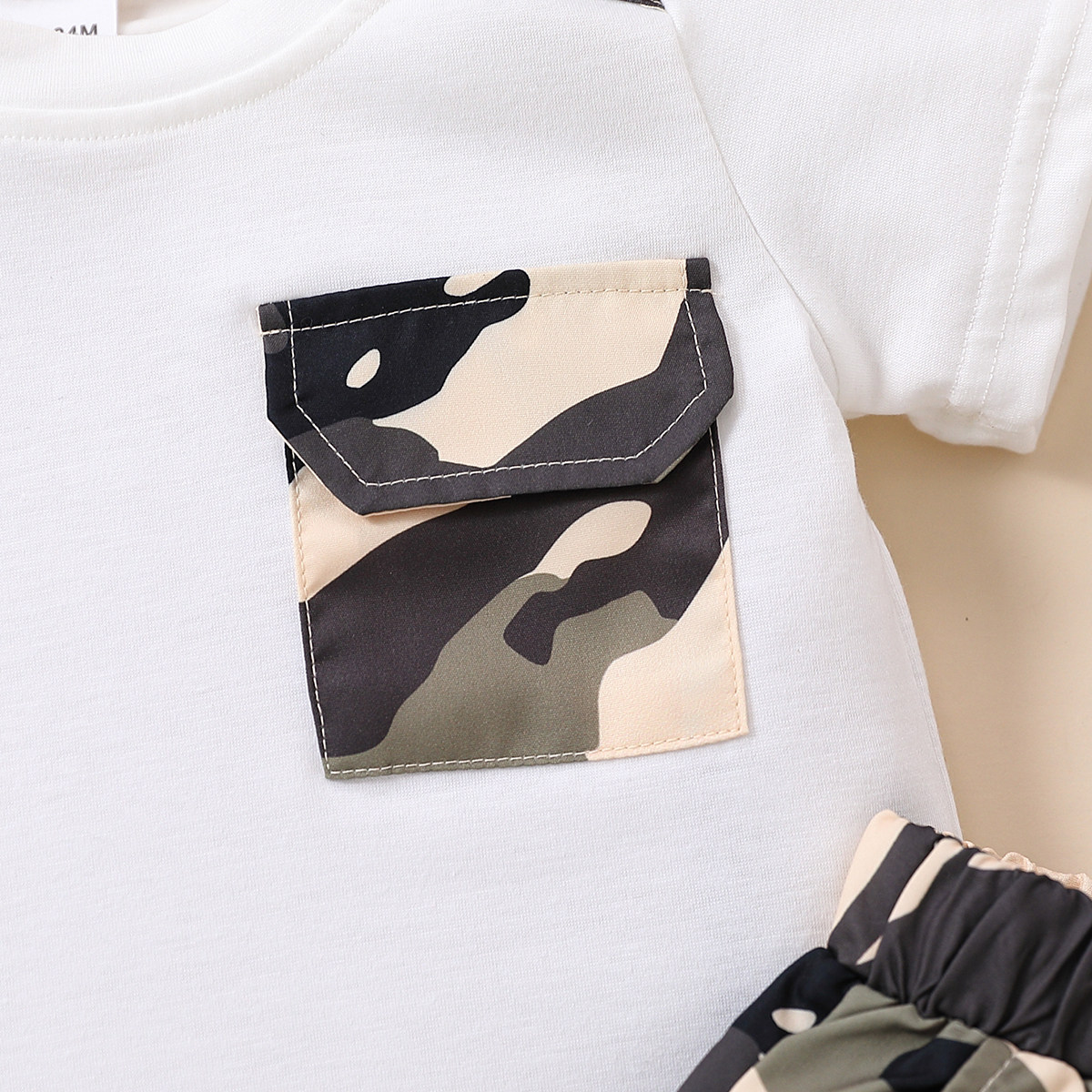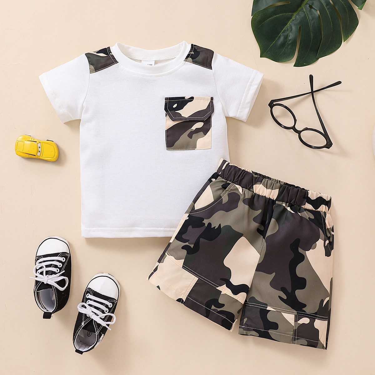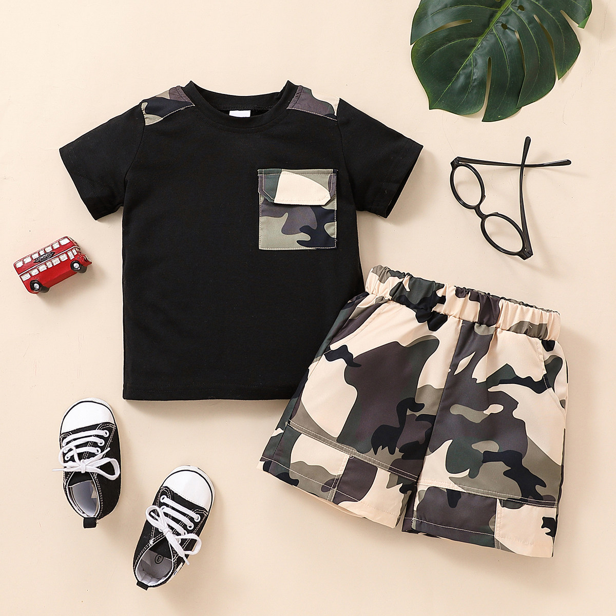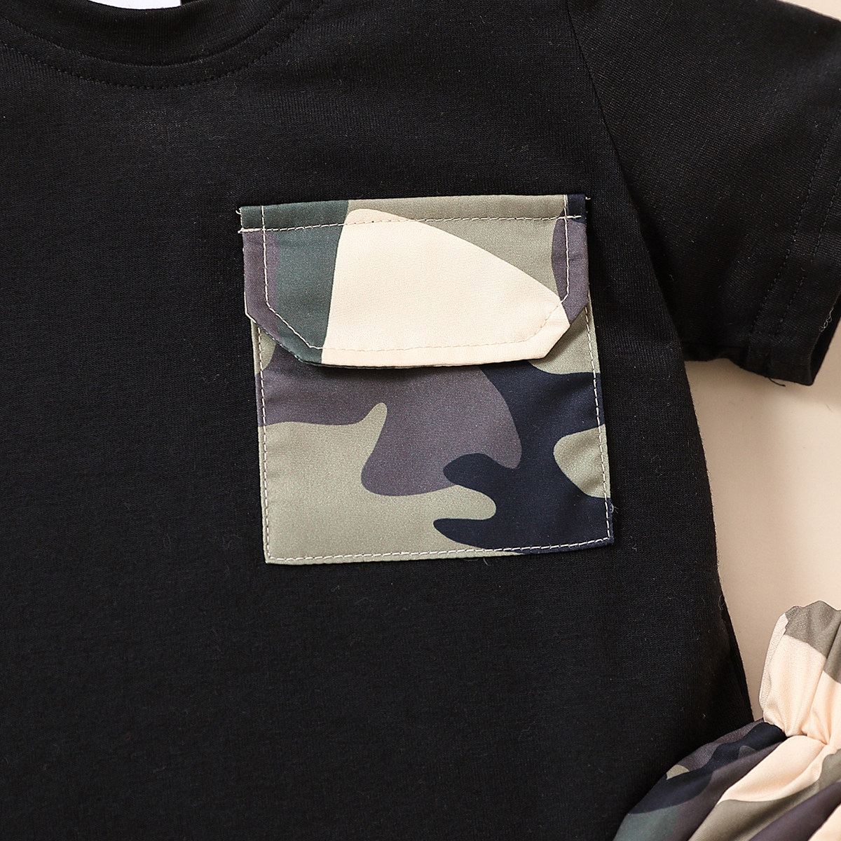 Toddler Boy Round Neck Camouflage Patchwork Print Pocket Top & Shorts Wholesale