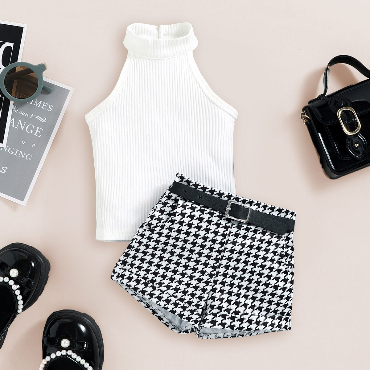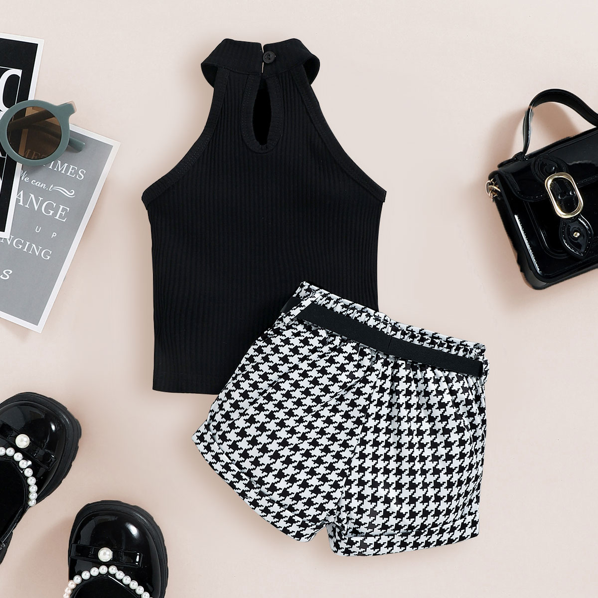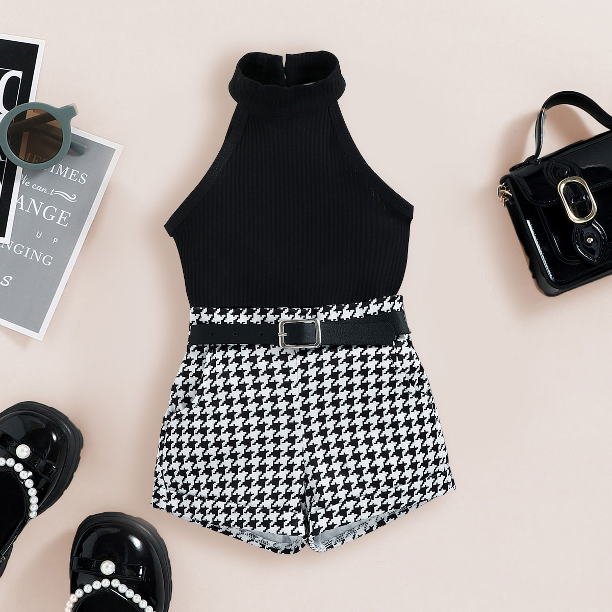 Toddler Girls Collar Stripes Houndstooth Sleeveless Top & Houndstooth Shorts Wholesale