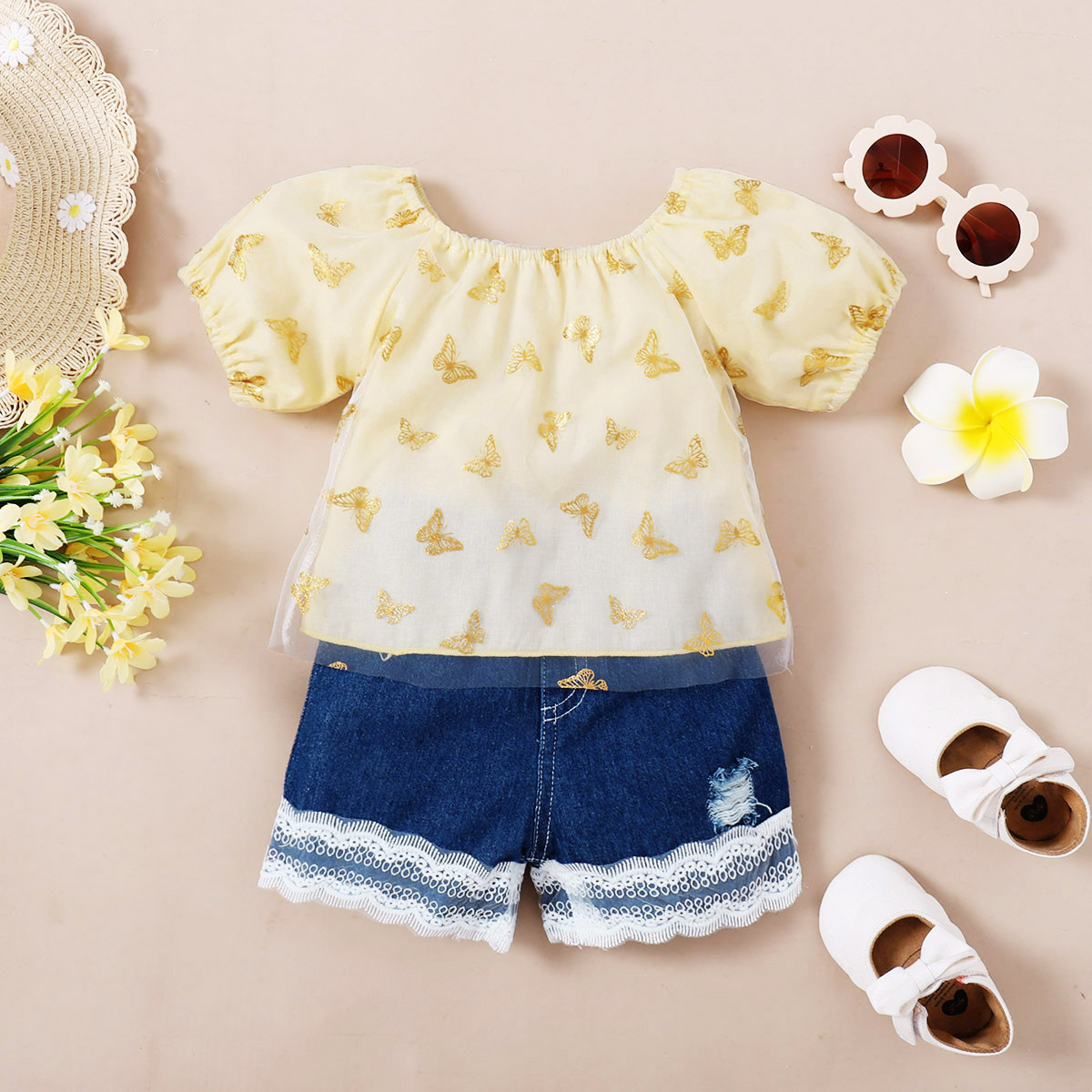 Toddler Girls Cotton Butterfly Color-block Top & Lace Shorts Wholesale
