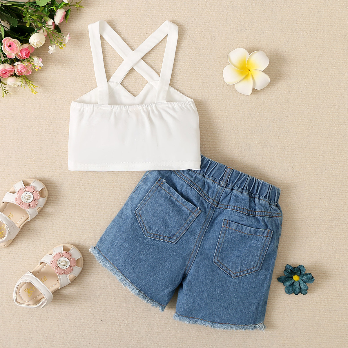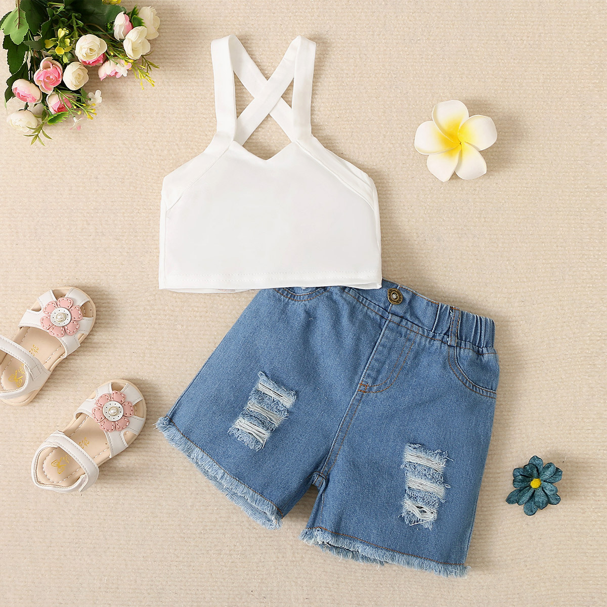 Toddler Girls Halter Neck Solid Top & Denim Shorts Wholesale