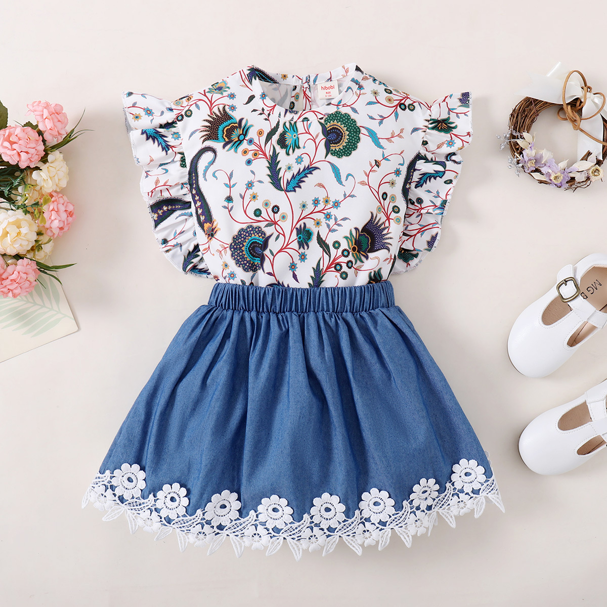 Toddler Girls Tropical Elegant Color-block Ruffles Top & Skirt Dress Set Wholesale