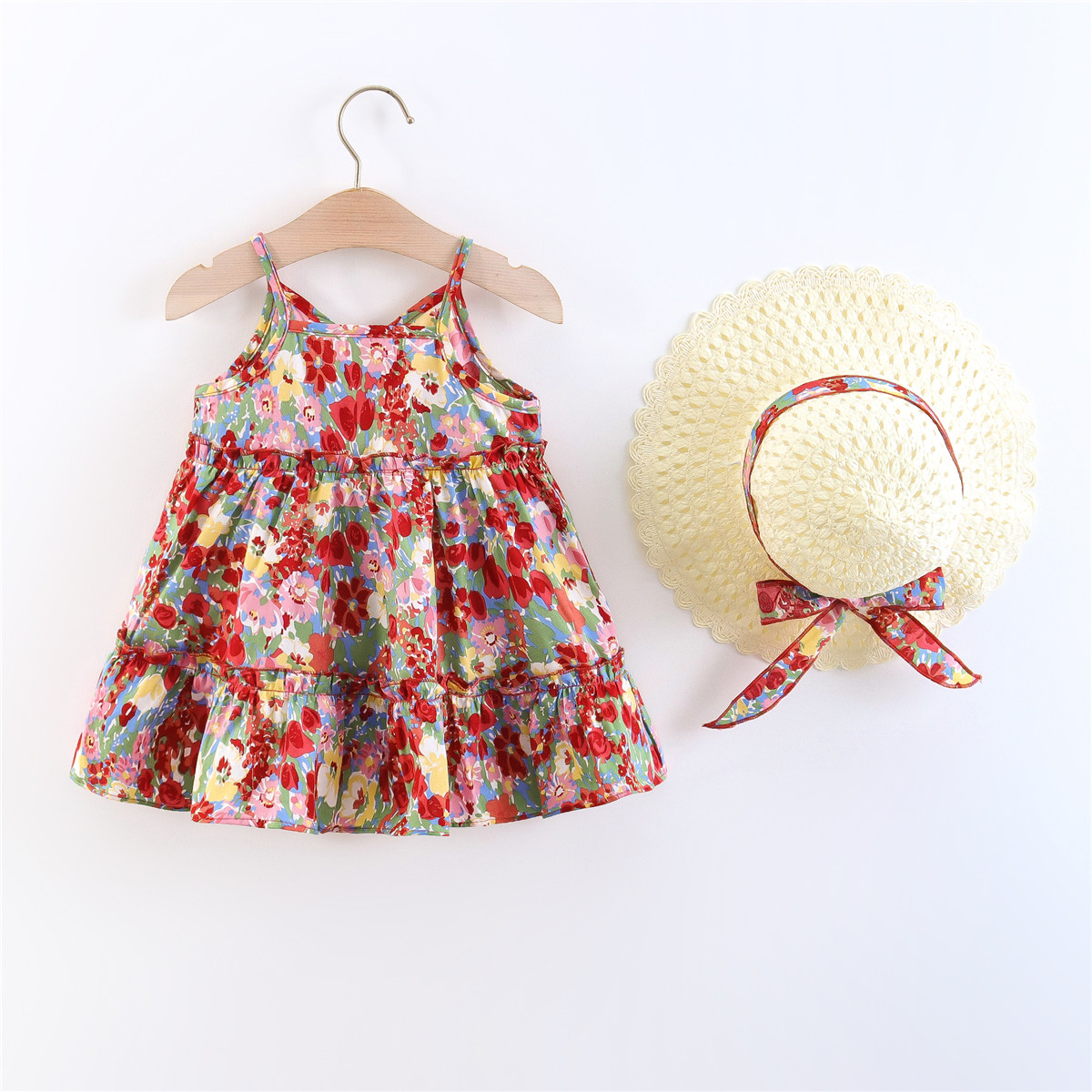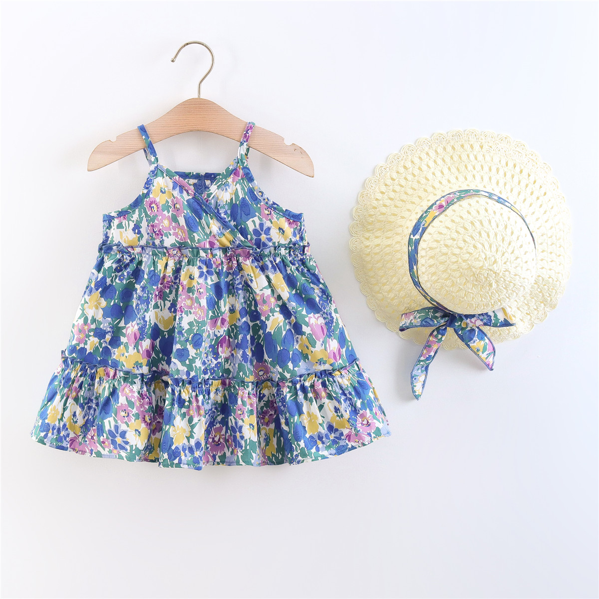Toddler Girls V-neck Floral Color-block Dress & Hat Wholesale