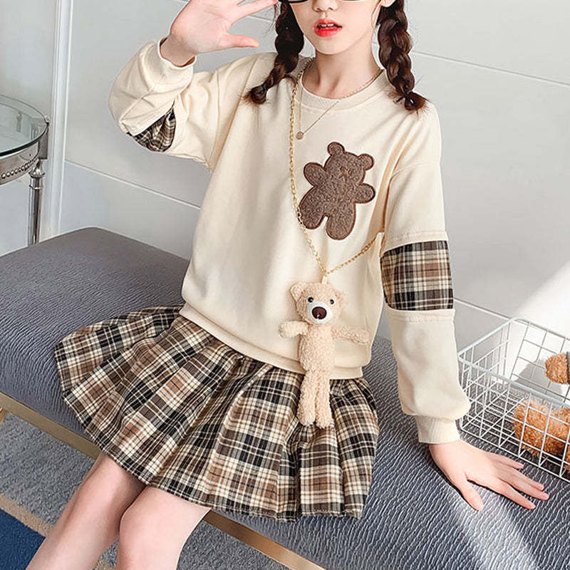 Kid Girl Bear Embroidered Blouse & Plaid Pleated Skirt Wholesale