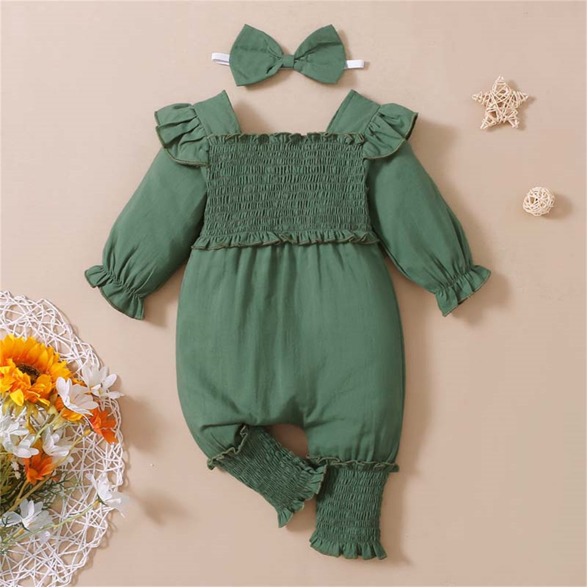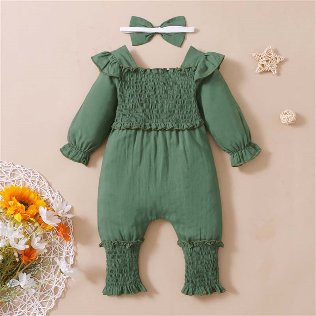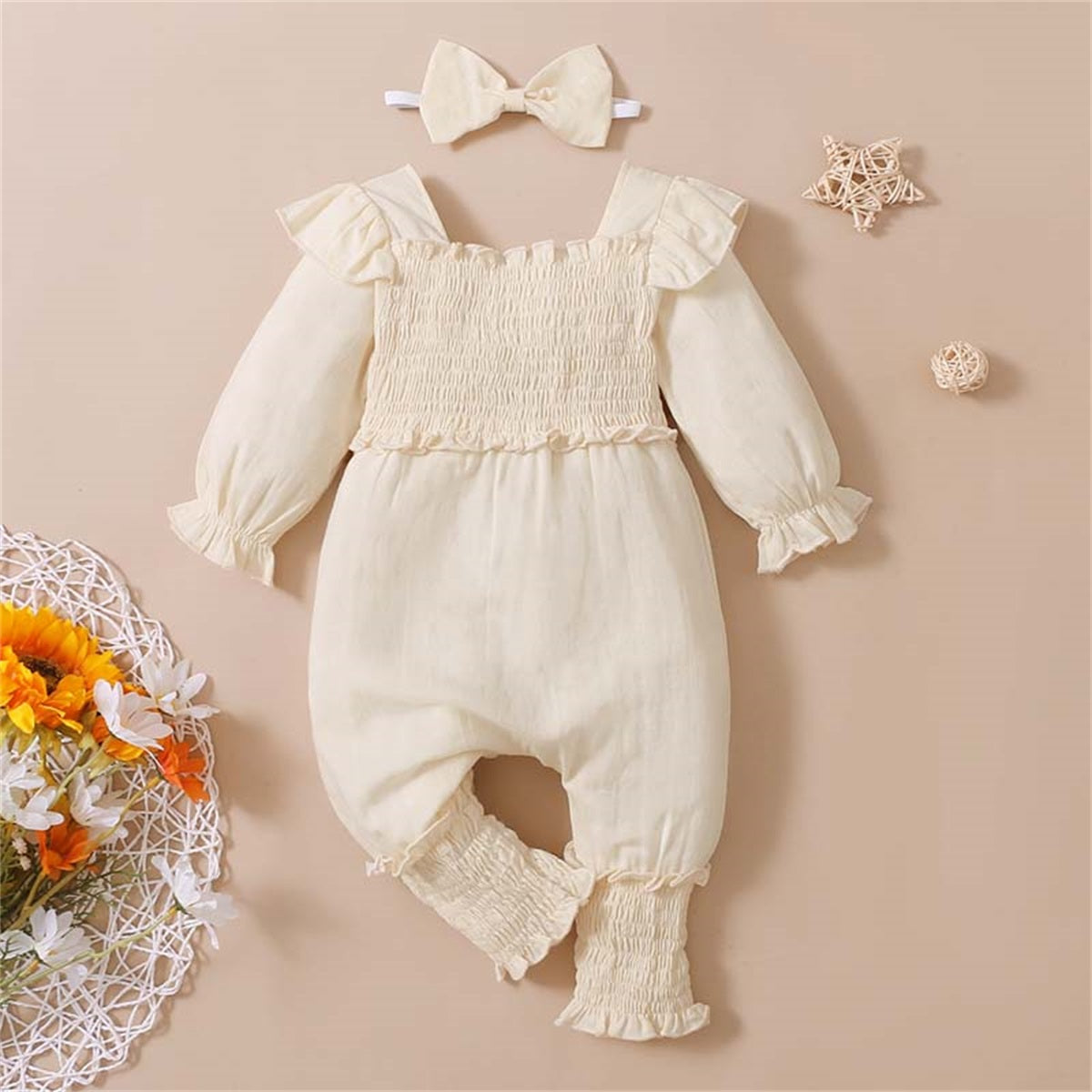 Baby Girl Sweet Ruffle Solid Long Sleeve Jumpsuit Headband Two-piece Wholesale