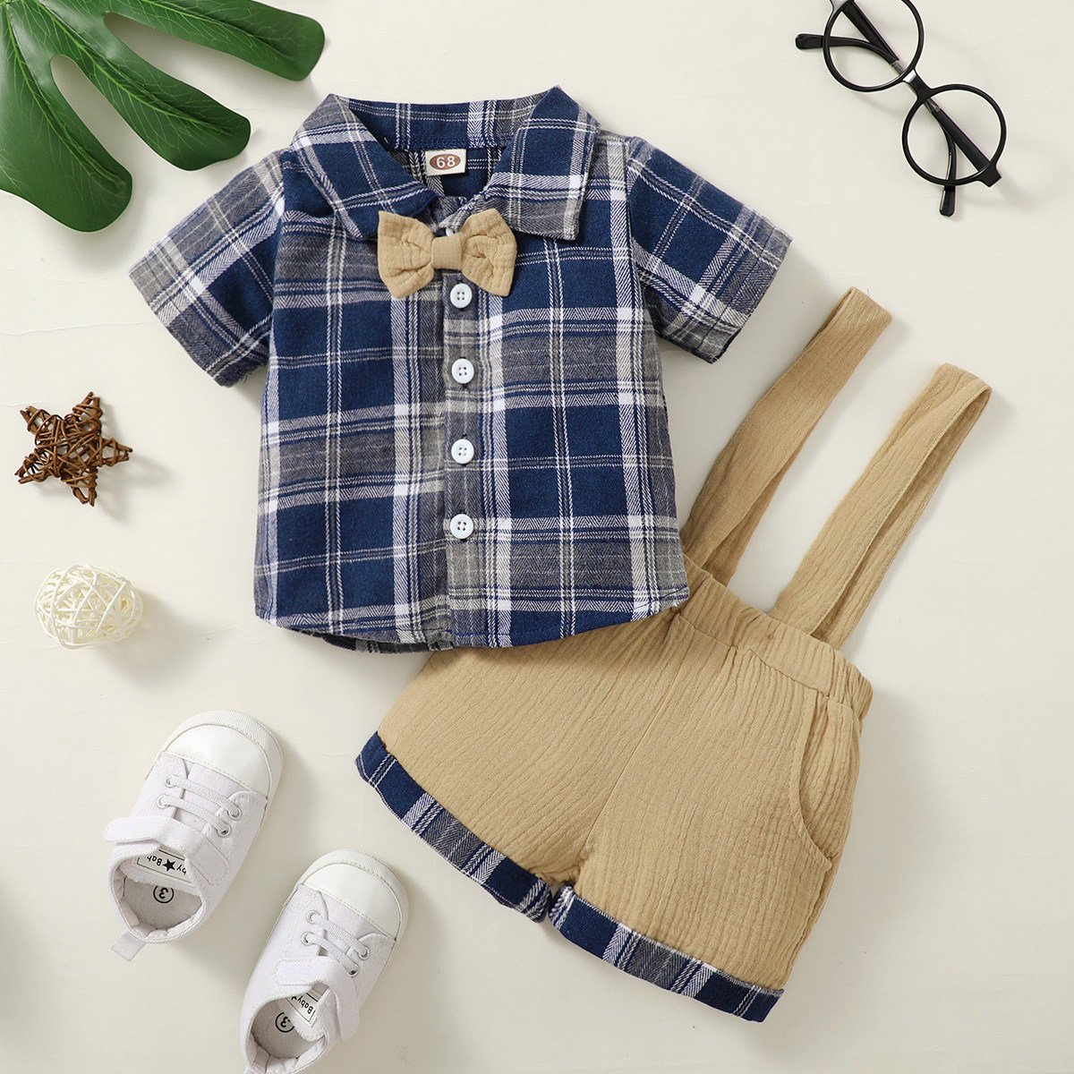 Baby Boy Gentleman Plaid Pattern Bow-knot Shirt & Suspender Shorts Wholesale