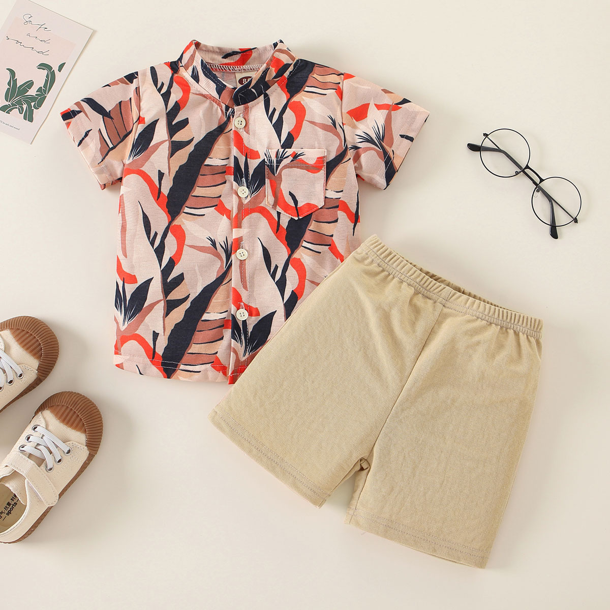 Baby Boy Tropical Leaves Pattern Pocket Decor Stand-collar T-Shirt & Shorts Wholesale
