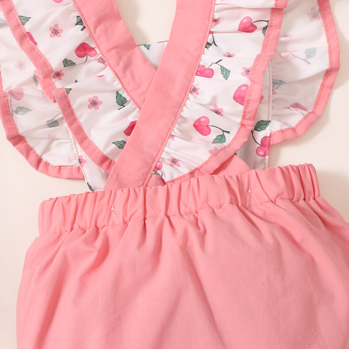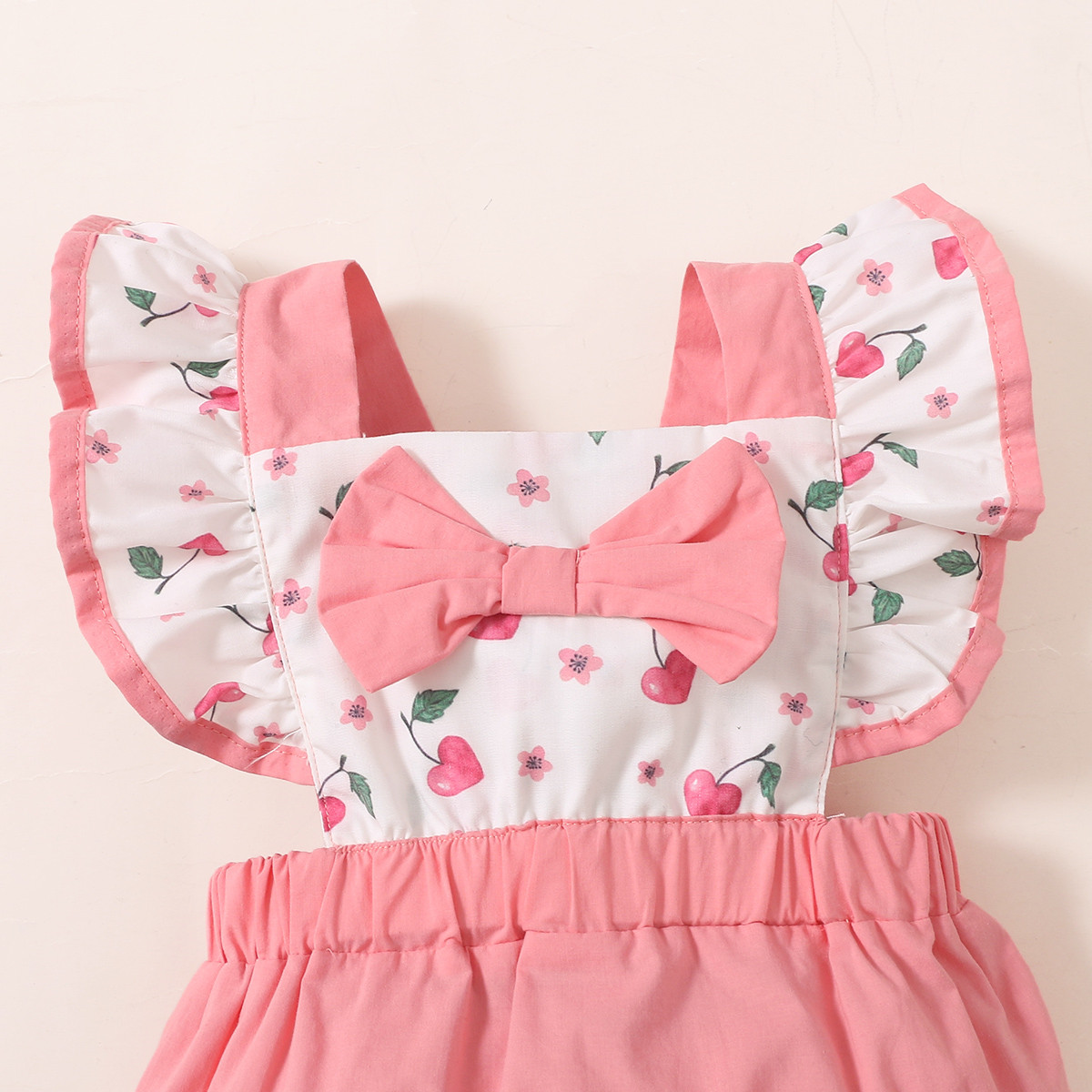 Baby Girl Color-block Ruffle-sleeve Floral Cherry Pattern Bow-knot Bodysuit Wholesale