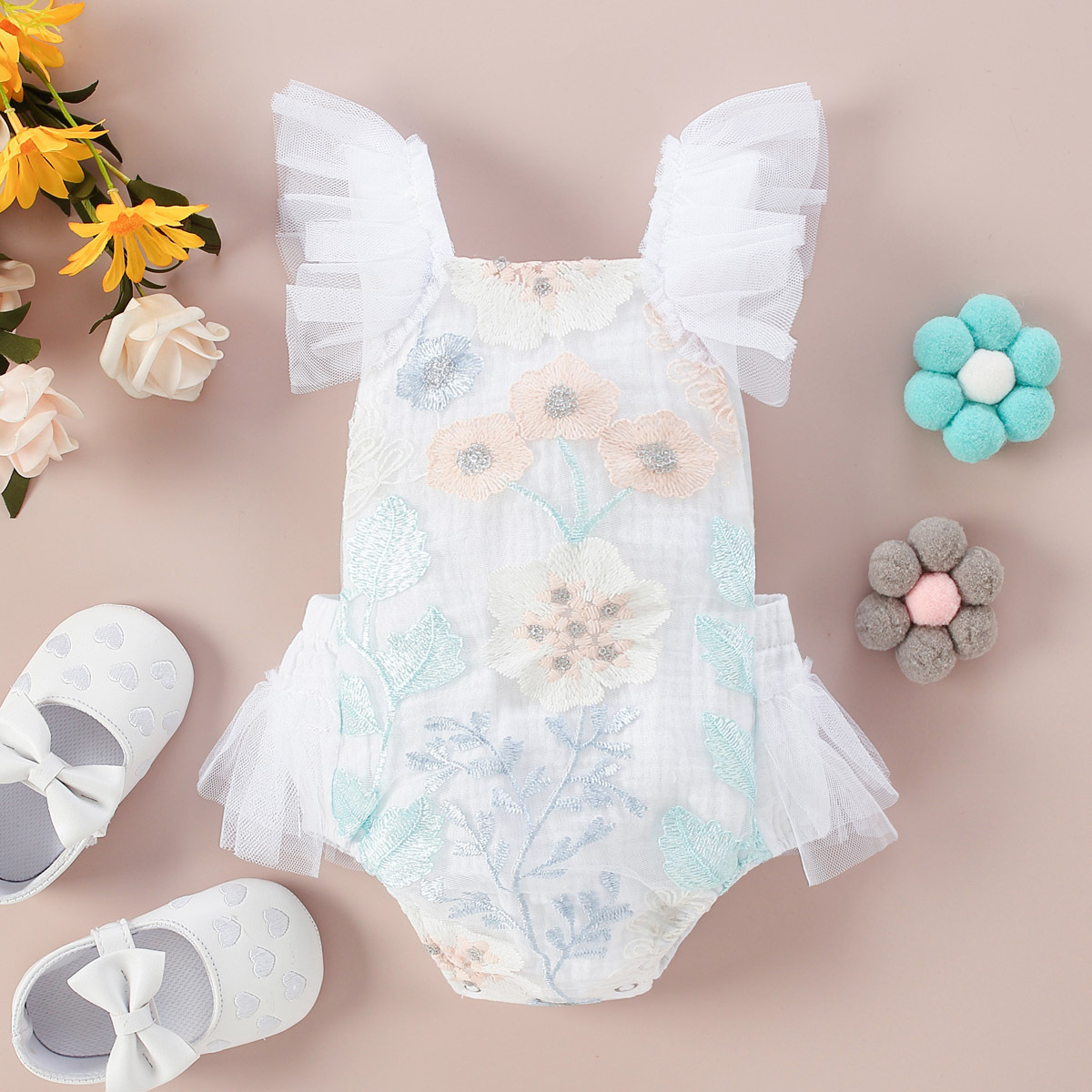 Baby Girl Embroidered Decorative Beads Floral Pattern Lace Decor Bodysuit Wholesale