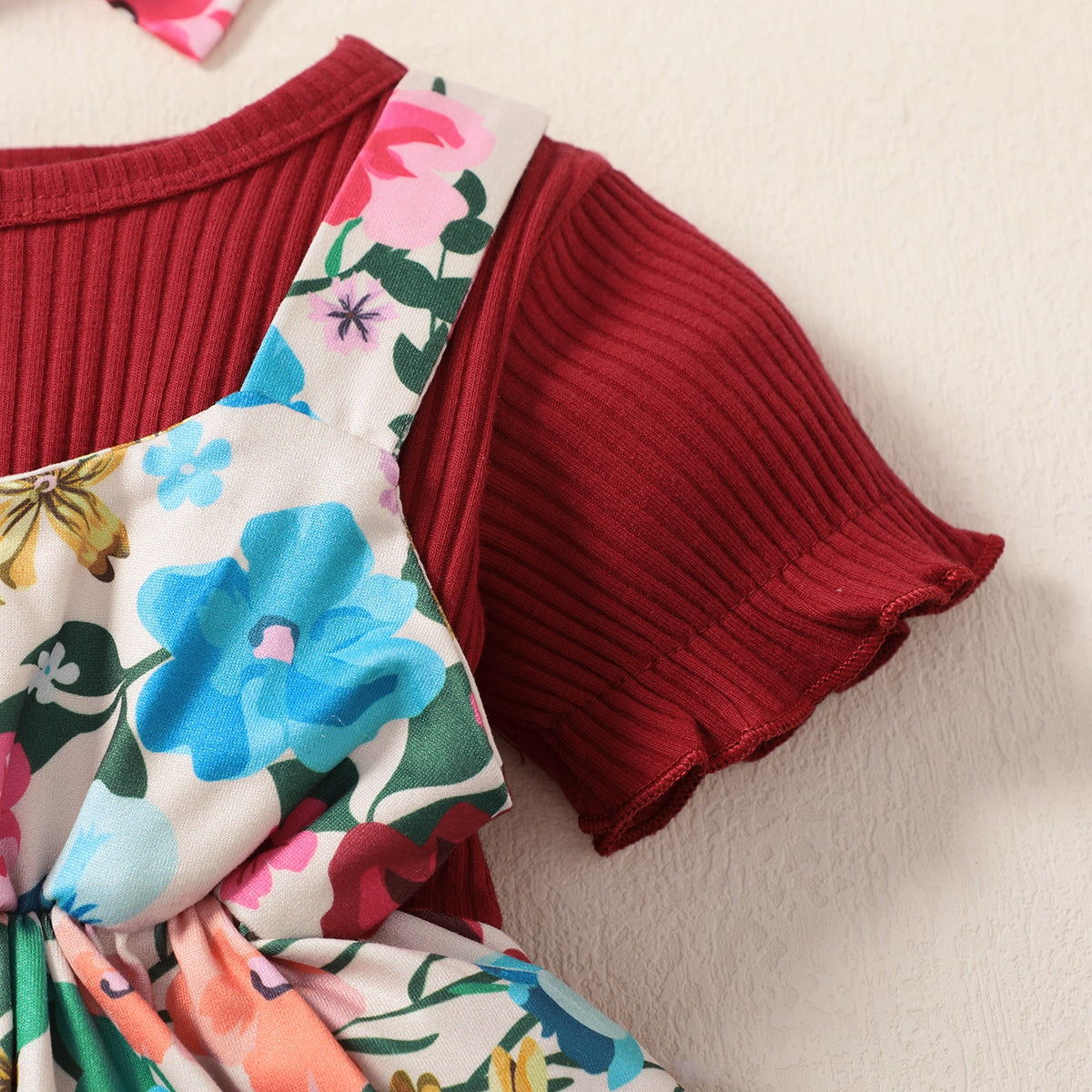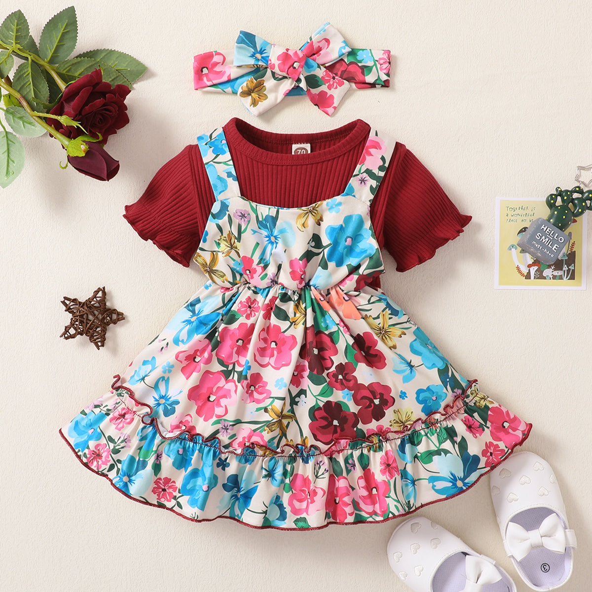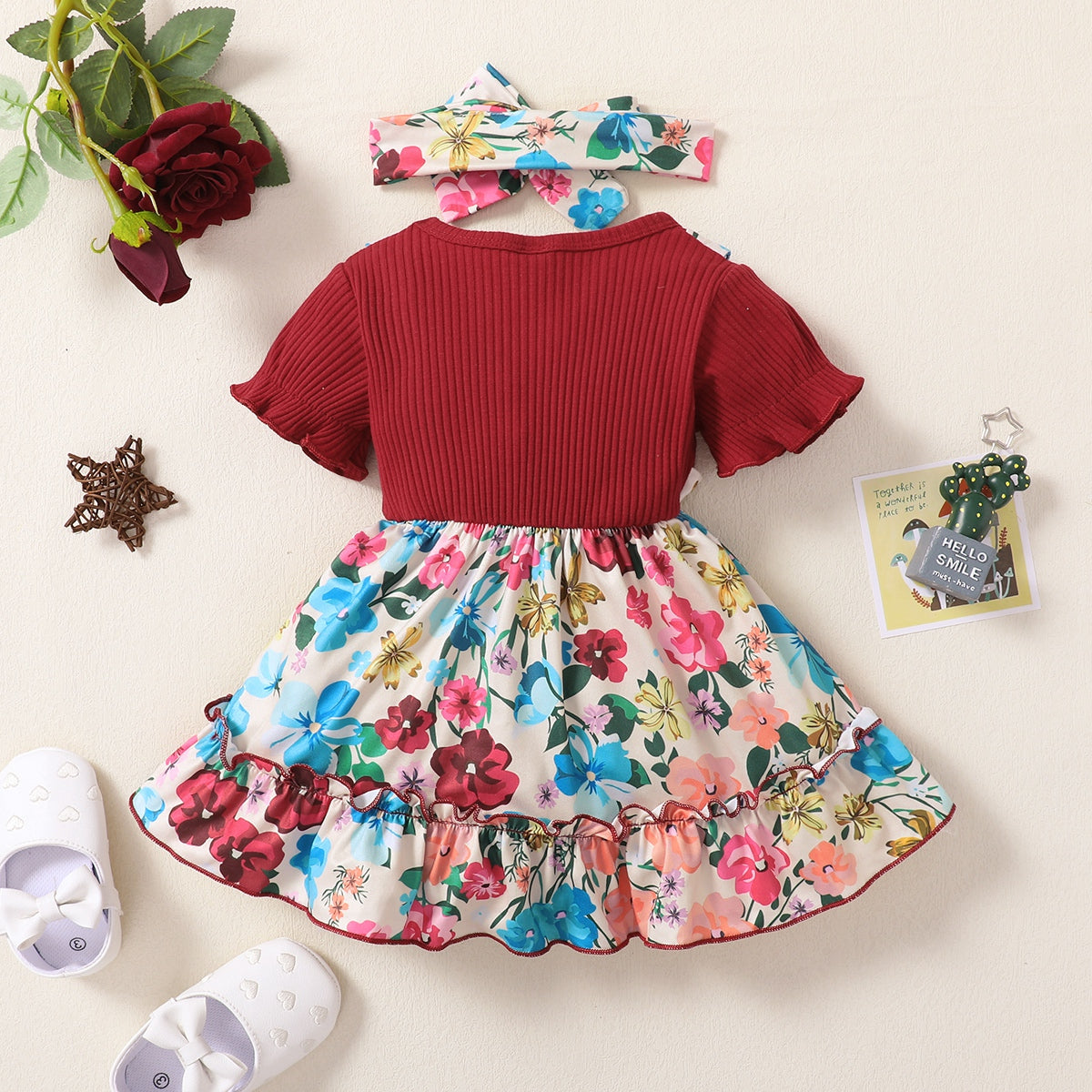 Baby Girl Fake Two Piece Patchwork Floral Print Dress with Headband Wholesale