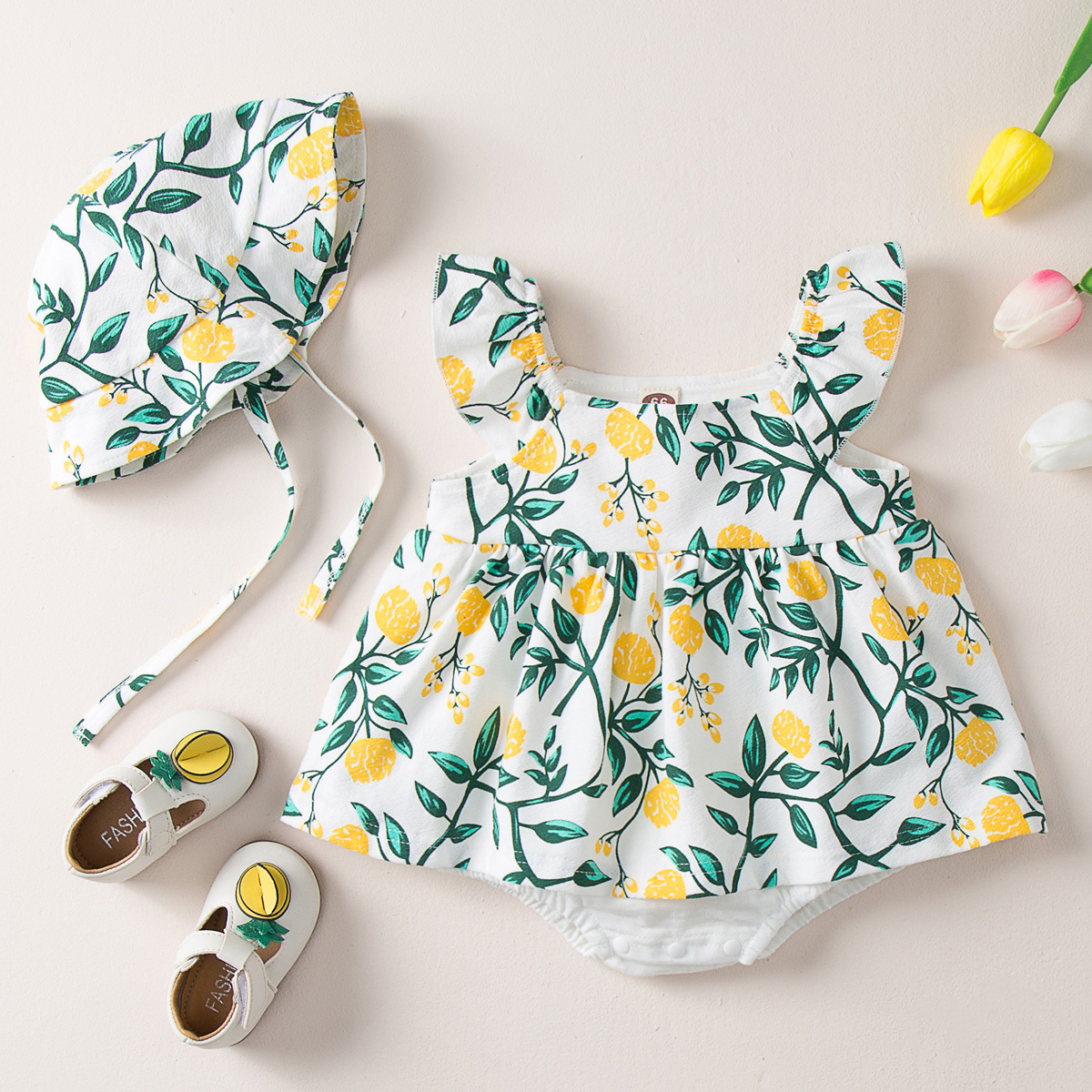 Baby Girl Floral Color-block Ruffle-sleeves Bodysuit & Sun Hat Wholesale