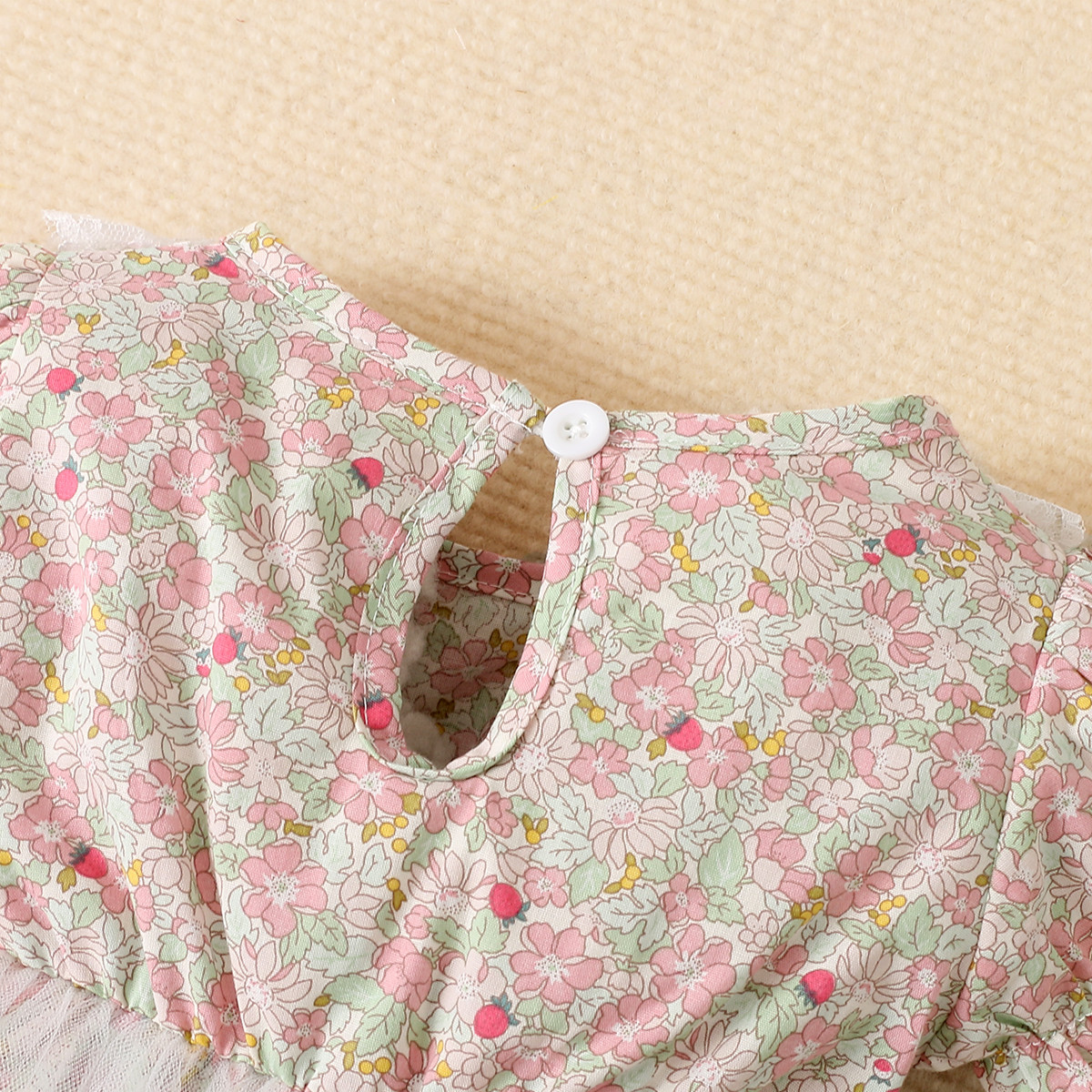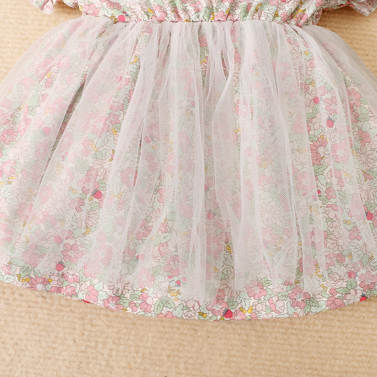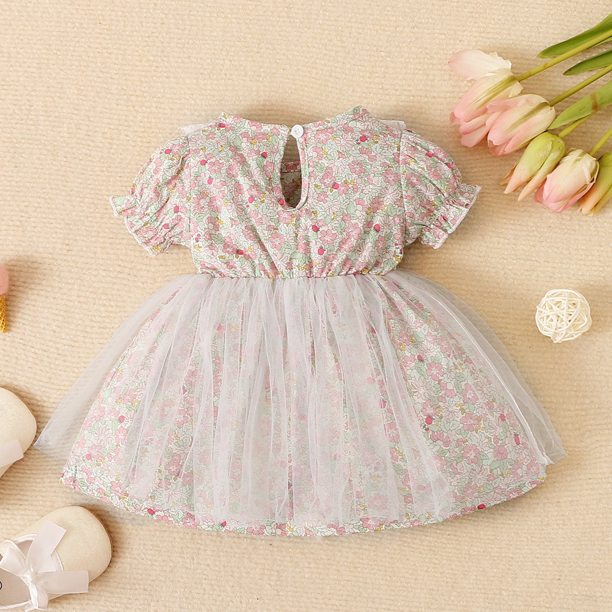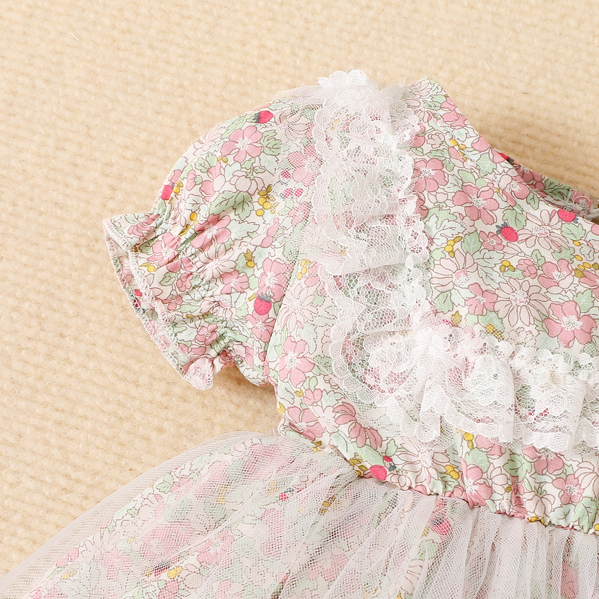 Baby Girl Floral Pattern Lace Decor Puff Sleeve Mesh Dress Wholesale